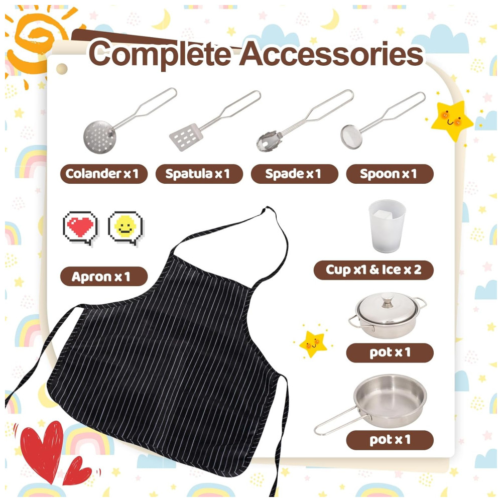 O quadro negro e o avental permitem que as crianças se tornem verdadeiros cozinheiros, escrevendo o cardápio do dia no quadro negro e vestindo o avental. Este conjunto de brinquedos de cozinha infantil é um ótimo presente para crianças com mais de 3 anos, ajudando a desenvolver e aprimorar a criatividade, a coordenação olho mão e o pensamento lógico no processo de brincar.