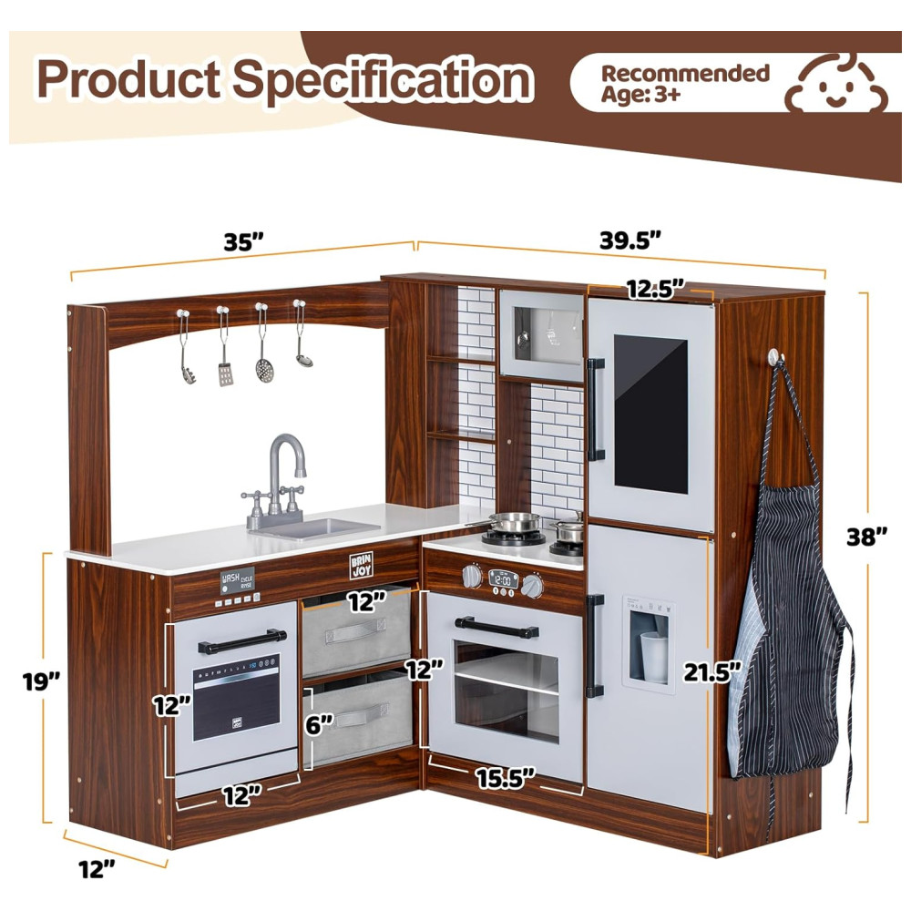 Construído em material MDF sólido, este conjunto de cozinha infantil é durável e resistente para uma longa vida útil. Todos os cantos são arredondados para fornecer proteção total para as crianças. Além disso, o design exclusivo do canto economiza espaço em casa e oferece às crianças mais espaço para brincar com os amigos.
