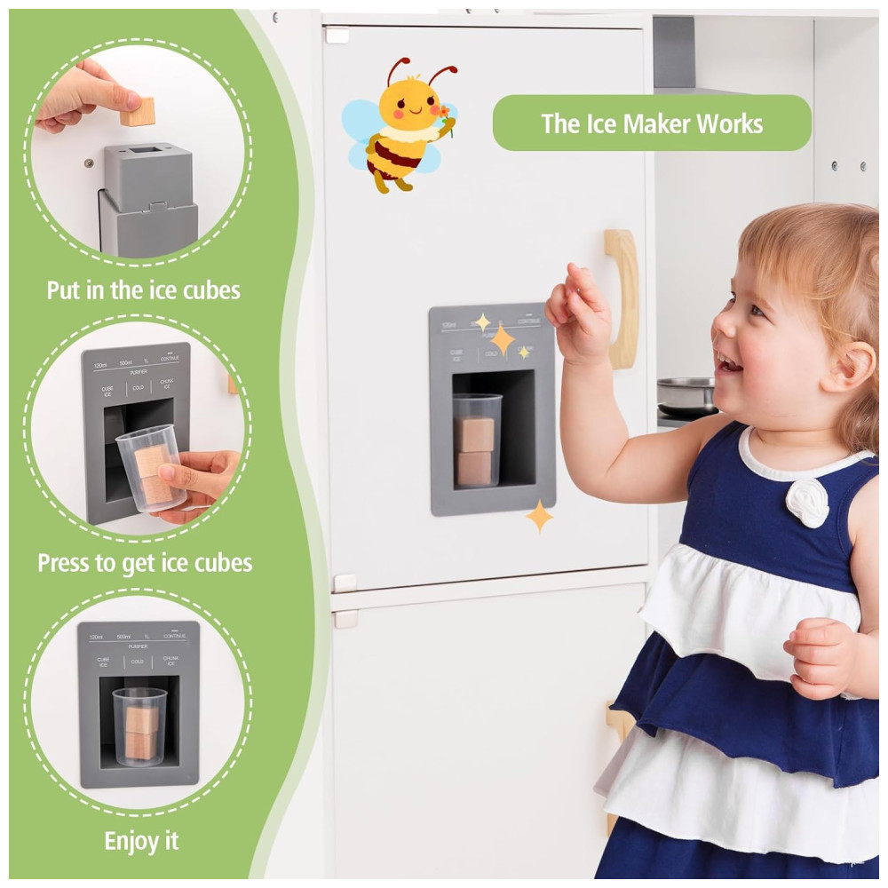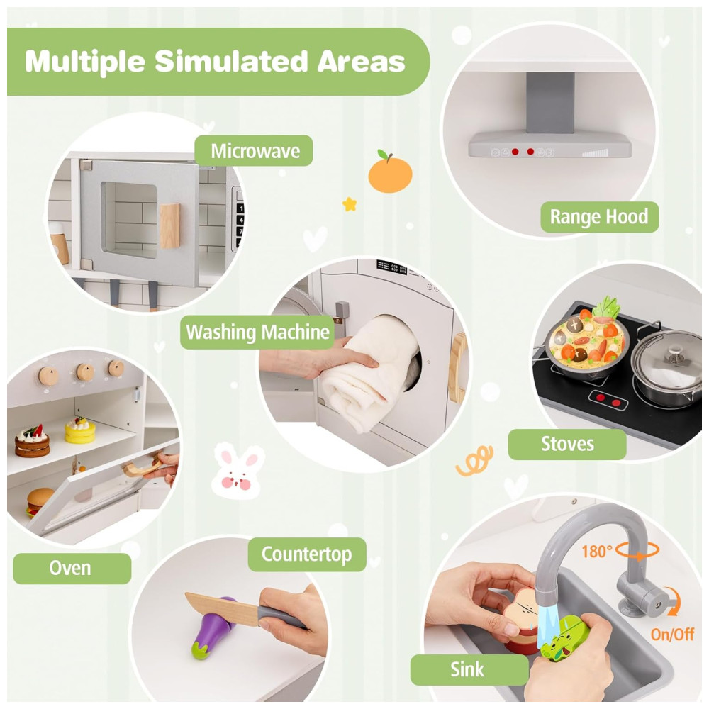 Este conjunto de cozinha infantil é perfeito para crianças que adoram cozinhar e se divertir. Com quatro áreas de lazer, as crianças podem brincar juntas e desfrutar de uma experiência imersiva na cozinha, com exaustor, micro ondas, máquina de fazer gelo, fogões, pia, forno e máquina de lavar. Além disso, há muito espaço de armazenamento para guardar os acessórios equipados e outros itens, ajudando as crianças a desenvolver bons hábitos de organização.