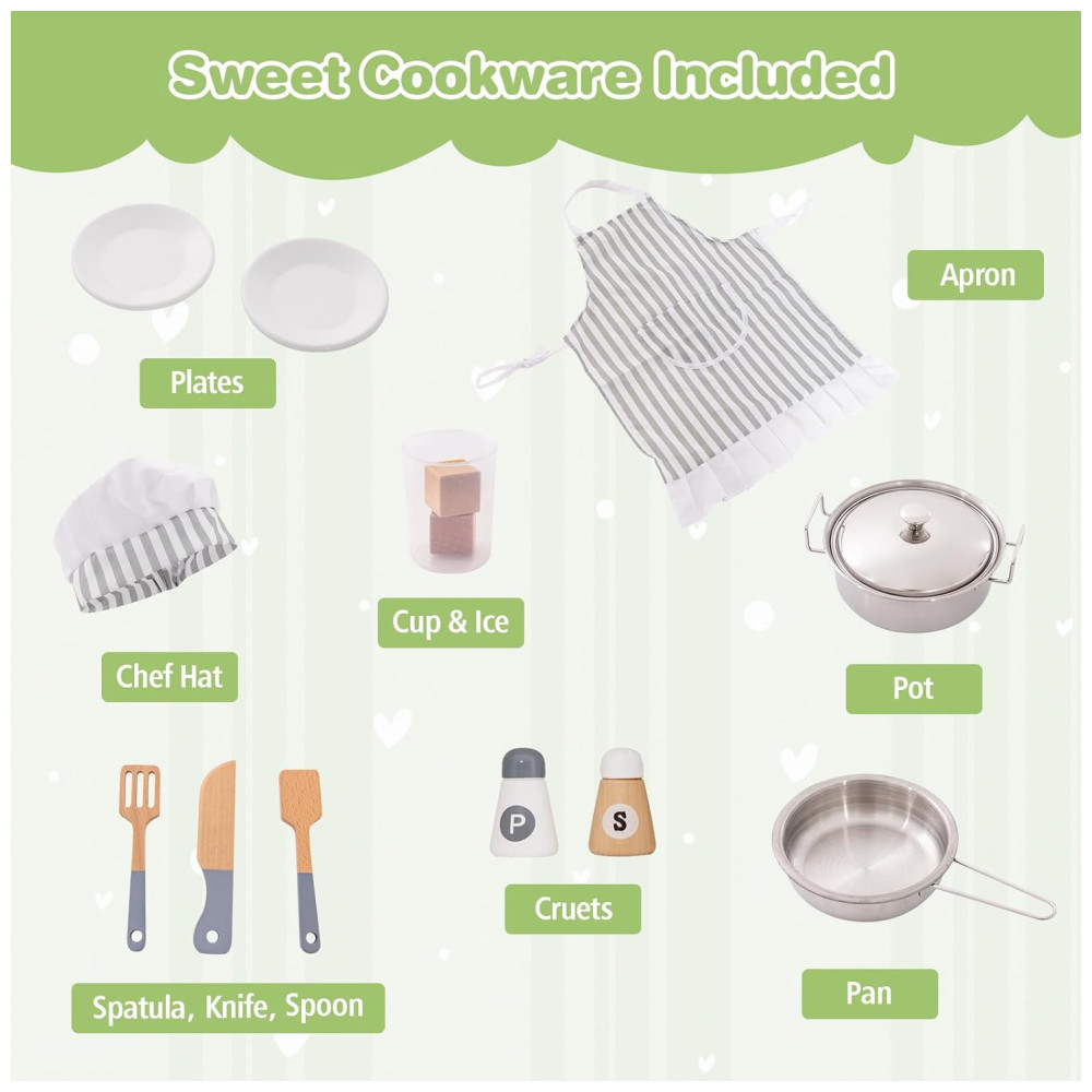 Certificado pela ASTM e CPSIA, este conjunto de cozinha infantil de canto de madeira é confiável e um presente perfeito para crianças de 3 anos, permitindo que elas aumentem a criatividade da imaginação, melhorem a habilidade prática, promovam habilidades sociais e muito mais.