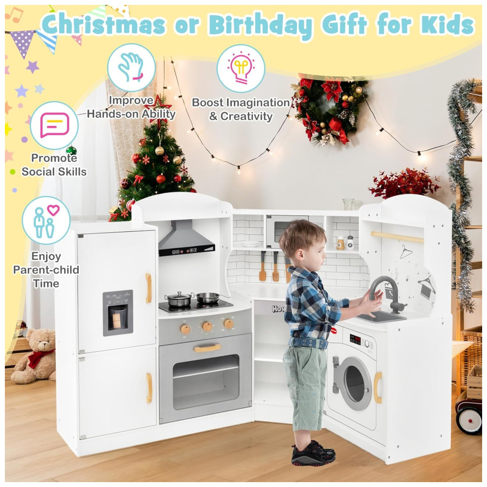A cozinha de canto para crianças apresenta um design de canto para aproveitar ao máximo o espaço nos cantos e é equipada com chapéu de chef, avental, utensílios e outros utensílios de cozinha, tornando mais conveniente para as crianças usarem. Construída com materiais cuidadosamente selecionados e isentos de BPA, esta cozinha infantil é segura e durável, com uma base alargada para garantir estabilidade geral.