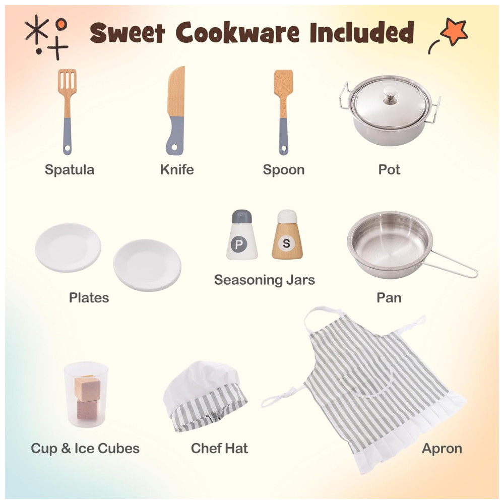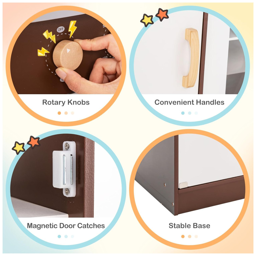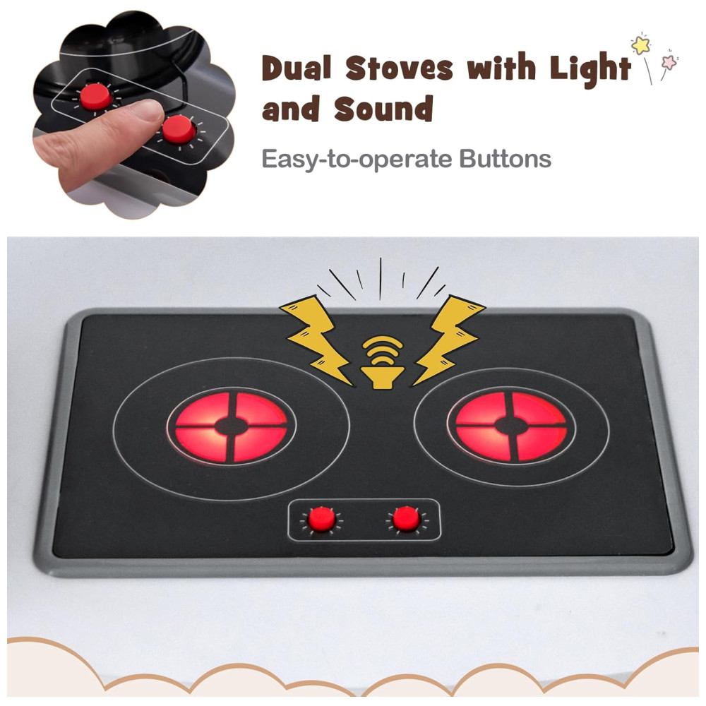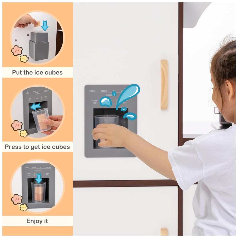 Os botões giratórios também emitem sons quando movidos, tornando a experiência mais realista. A máquina de fazer gelo é capaz de produzir cubos de gelo reais e a máquina de lavar louça simulada permite que as crianças finjam assar e limpar pratos. Há uma prateleira superior e duas prateleiras abertas para armazenamento de alimentos para brincar, além de três ganchos para utensílios. O conjunto de cozinha também possui um quadro negro para desenho e escrita.