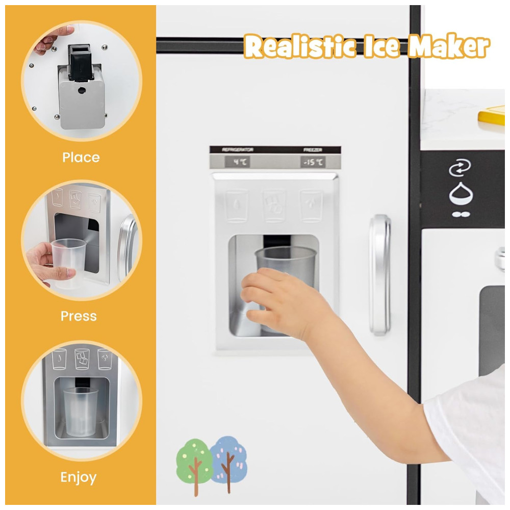 Os botões giratórios também emitem sons quando movidos, tornando a experiência mais realista. A máquina de fazer gelo é capaz de produzir cubos de gelo reais e a máquina de lavar louça simulada permite que as crianças finjam assar e limpar pratos. Há uma prateleira superior e duas prateleiras abertas para armazenamento de alimentos para brincar, além de três ganchos para utensílios. O conjunto de cozinha também possui um quadro negro para desenho e escrita.