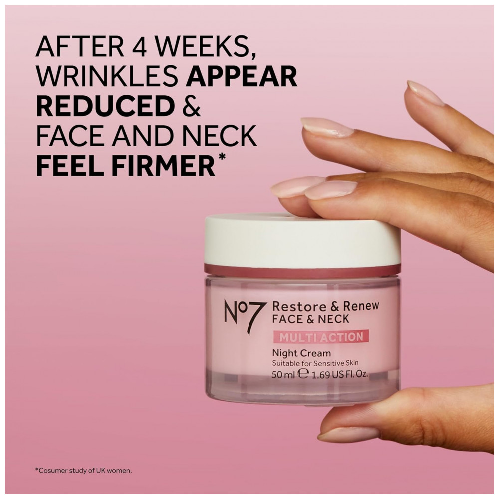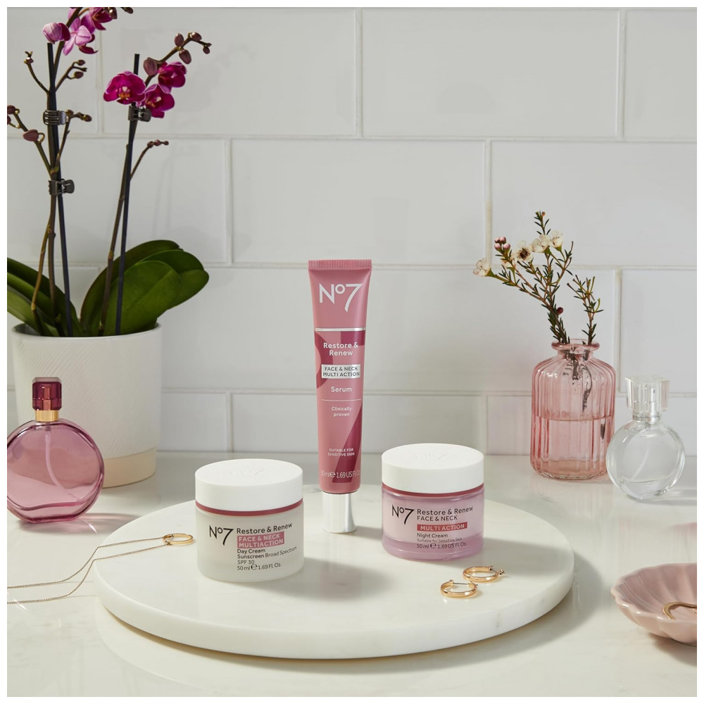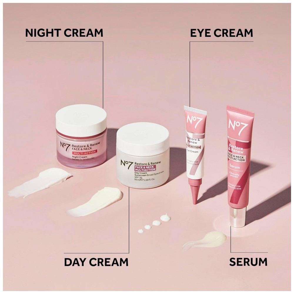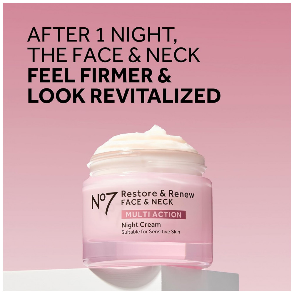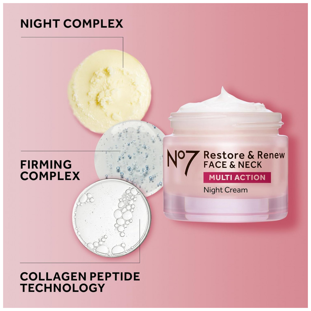 Creme Noturno de Renovação para Rosto e Pescoço No7: O Creme Noturno de Renovação para Rosto e Pescoço da No7 é uma solução focada para combater os sinais de envelhecimento na pele madura. Formulado com a tecnologia antienvelhecimento do Clinicamente Comprovado Multi Action Serum, este creme contém ingredientes poderosos, como ácido hialurônico, manteiga de karité e vitamina E, que atuam em sinergia para revitalizar a pele durante a noite.