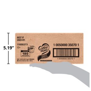 Nestlé Coffee mate é um creme de café com sabor de baunilha francesa que adiciona um sabor rico e cremoso de baunilha à sua xícara de café. É perfeito para ser utilizado em qualquer lugar, basta misturá-lo em uma xícara de café para obter um sabor delicioso. O creme líquido é livre de lactose e colesterol, combina rápida e completamente com bebidas quentes e frias. Ele é estável na prateleira e não precisa de refrigeração, mantendo seu sabor delicioso em temperatura ambiente por até 9 meses. A caixa contém 180 singles. O Coffee mate oferece diversas soluções para todas as necessidades, como cremes líquidos individuais, cremes em pó, frascos de bombeamento de líquidos, cremes a granel e muito mais para manter o café do escritório e os postos de alimentação abastecidos. Além disso, o produto é uma ótima opção para quem busca benefícios dietéticos, pois é não lácteo, sem lactose, sem colesterol e sem glúten. É também certificado como Kosher.