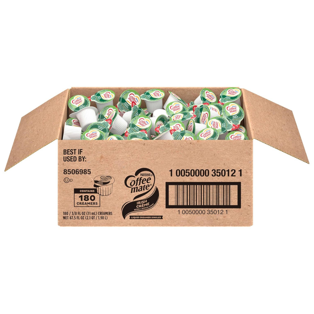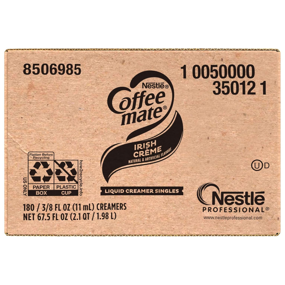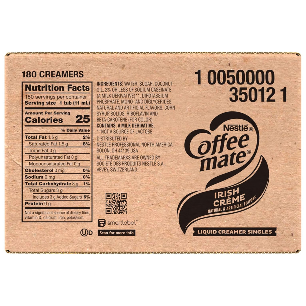 O Nestlé Coffee mate Irish é um creme líquido com sabor inspirado nas tradições do café irlandês. Cada xícara de café pode ser enriquecida com um toque suave e amanteigado que diferencia a bebida. A caixa contém 180 unidades, oferecendo uma opção deliciosa e conveniente para personalizar sua bebida favorita. O produto não precisa ser refrigerado e pode reter seu sabor por até 9 meses em temperatura ambiente. É fácil de usar, basta agitar, abrir e despejar. Além disso, o produto é não lácteo, sem lactose, sem colesterol, sem glúten e possui certificação Kosher. Coffee mate é o creme de café número 1 na América, oferecendo uma variedade de sabores e formatos para atender às necessidades dos consumidores. Ideal para ser utilizado em locais de trabalho, salas de descanso ou cozinhas, o creme líquido Coffee mate encanta funcionários, clientes e convidados. O produto é oferecido em diferentes soluções, como cremes líquidos individuais, cremes em pó, frascos de bombeamento de líquidos, cremes a granel e muito mais. Além disso, o Nestlé Coffee mate é uma opção dietética, pois é não lácteo, sem lactose, sem colesterol, sem glúten e possui certificação Kosher.