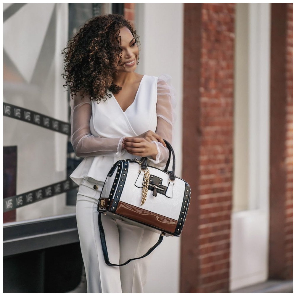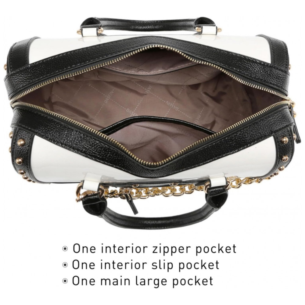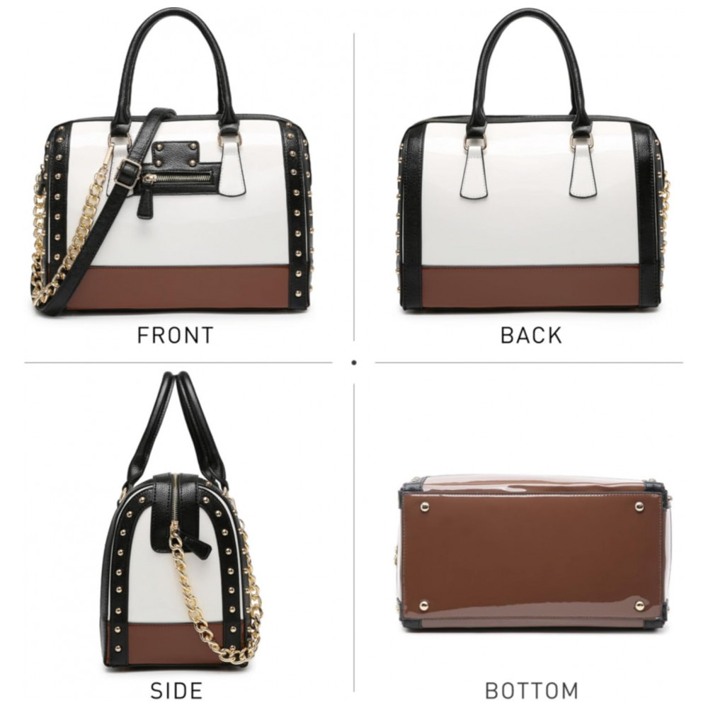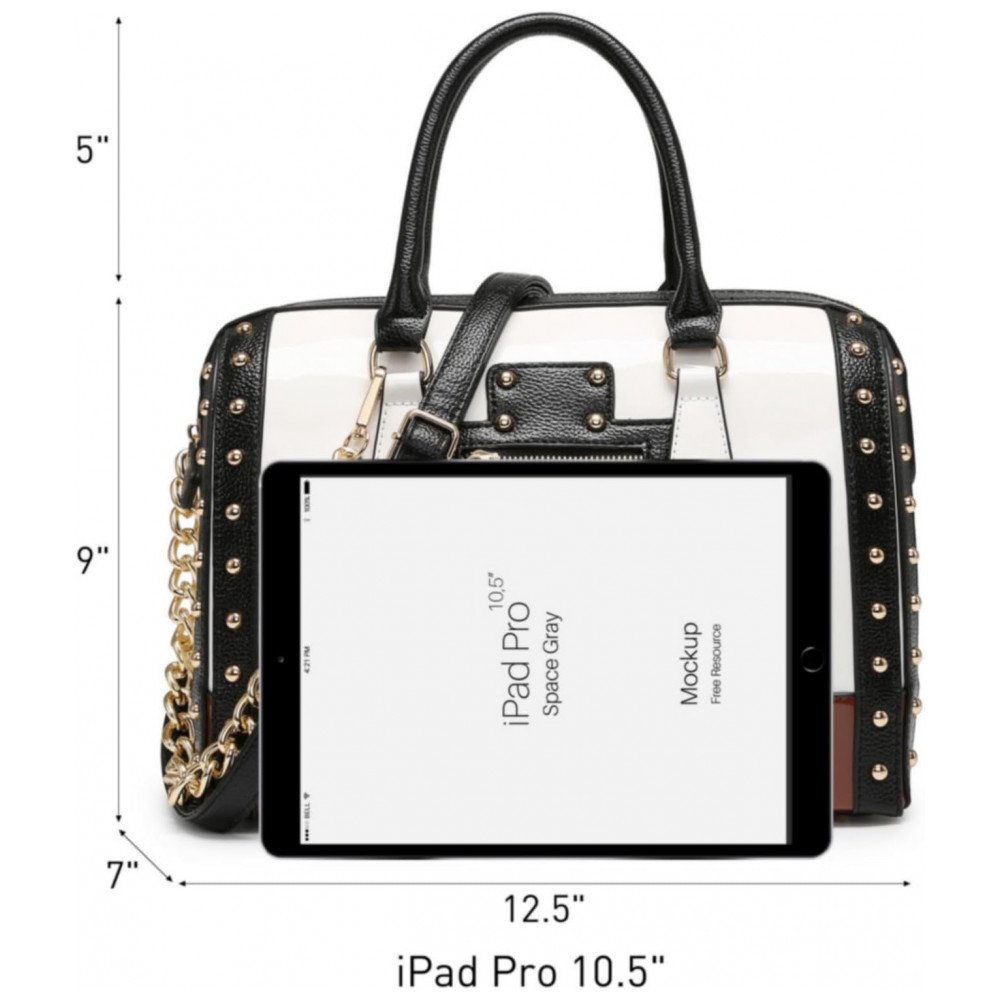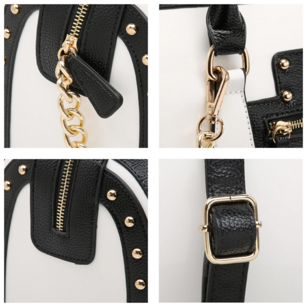 CARACTERÍSTICAS Fechamento superior com zíper, tachas de proteção na parte inferior plana e tachas decorativas na borda de três painéis, hardware tom dourado e design de emenda em dois tons. Perfeito para namorar, fazer compras, trabalhar, viajar, vocação etc.