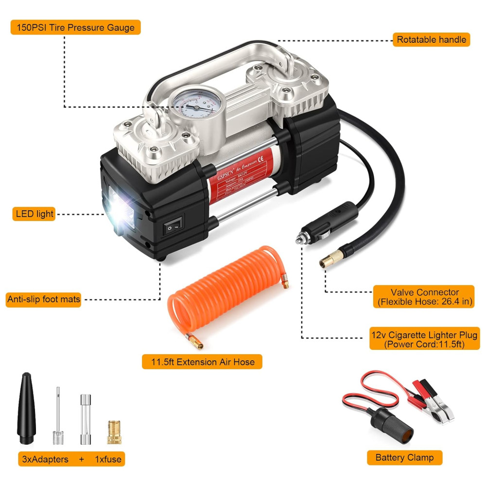 de Ar Portátil 12V 150 PSI com LED e duplo cilindro GSPSCN Dual Cylinder Air Compressor Pump Prateado
