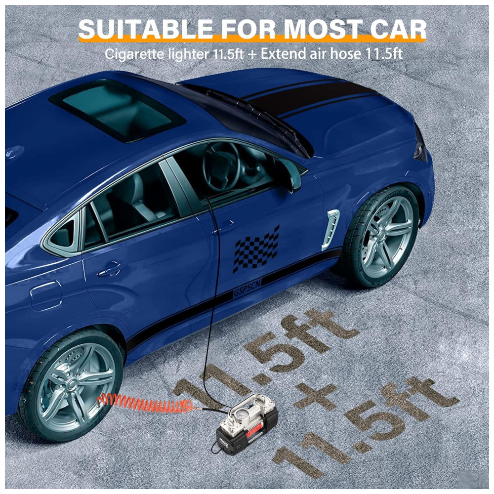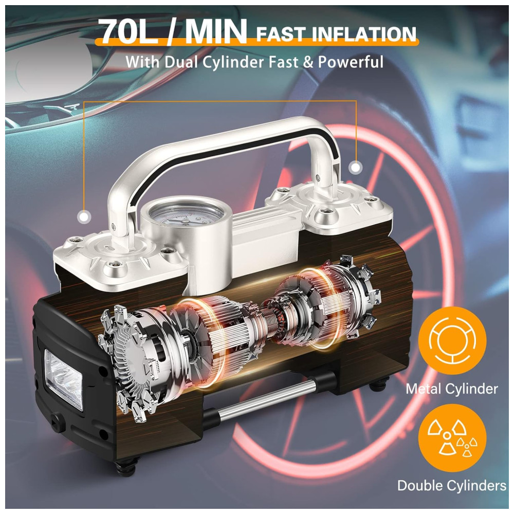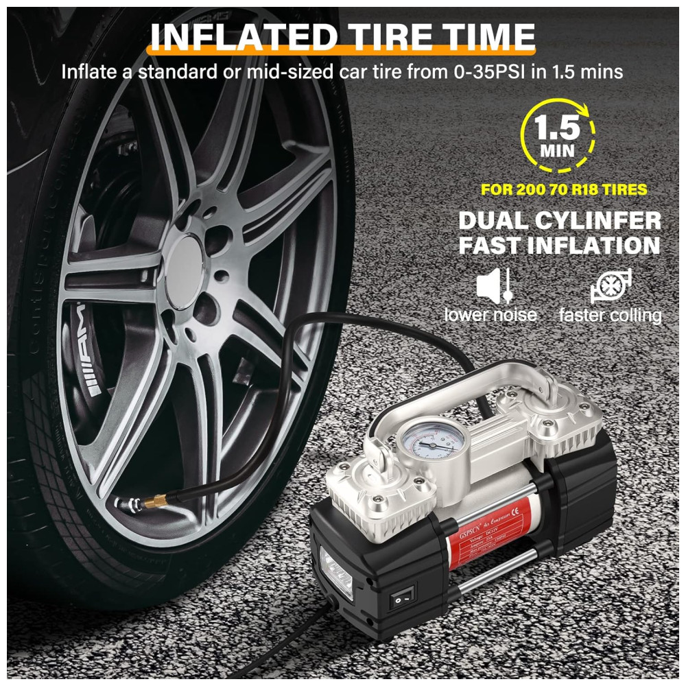 INFLAÇÃO RÁPIDA pressão máxima 150PSI, fluxo de ar 2.12CFM, infla o pneu padrão do veículo em 1,5 minutos 195, 65 , R16, 0 35psi Com cilindros duplos, este compressor de ar portátil de 12V produz um fluxo de 70L , min 4X mais rápido do que outros.