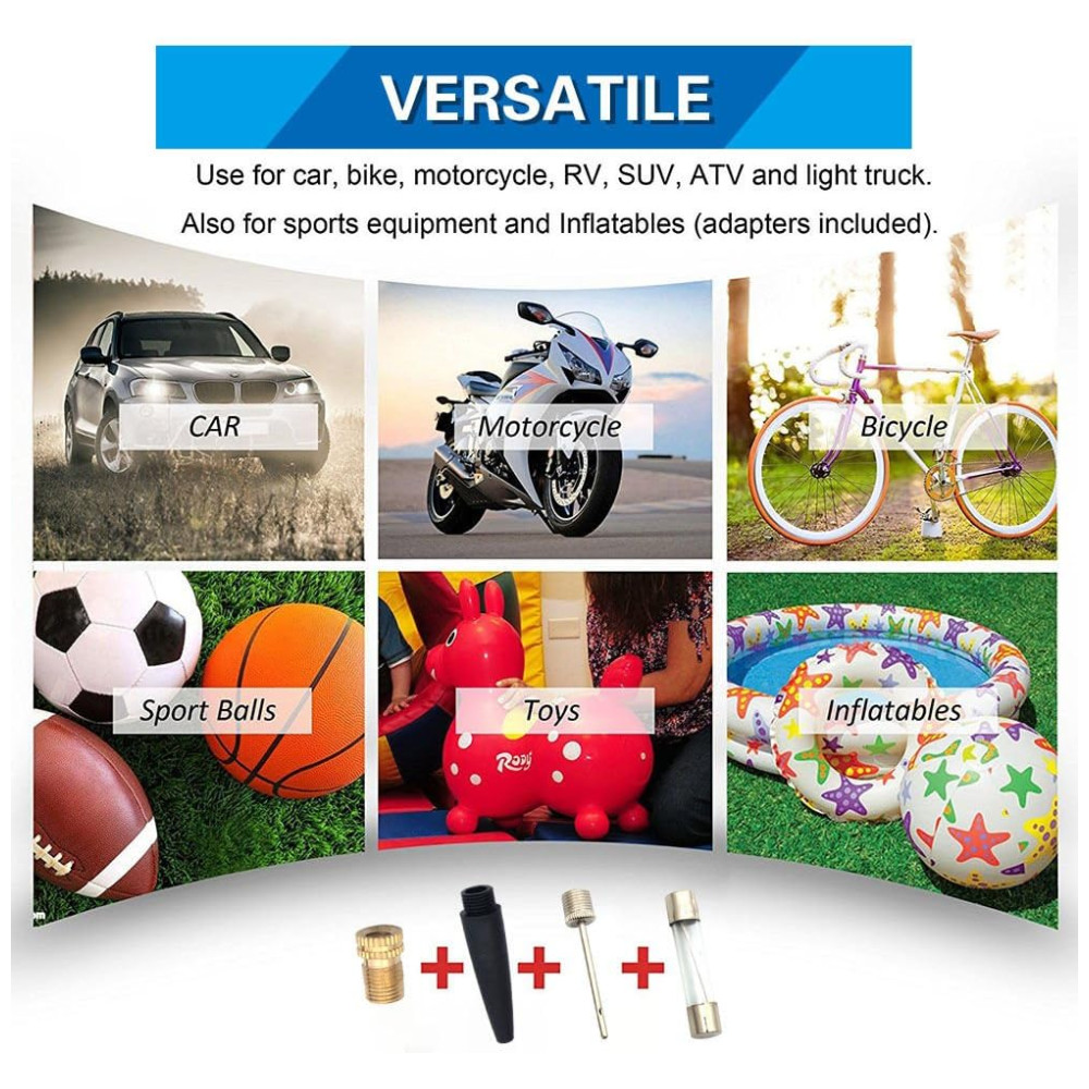 TRABALHOS particularmente adequado para SUVs, caminhões, vans, RVs, crossovers, MPVs, campistas, reboques, minivans, também pode ser para carros, motocicletas, carrinhos de golfe, bicicletas e muito mais. com vários adaptadores para combinar com seu bico. Basta conectá lo à bateria do carro ou ao isqueiro do carro para ligá lo.