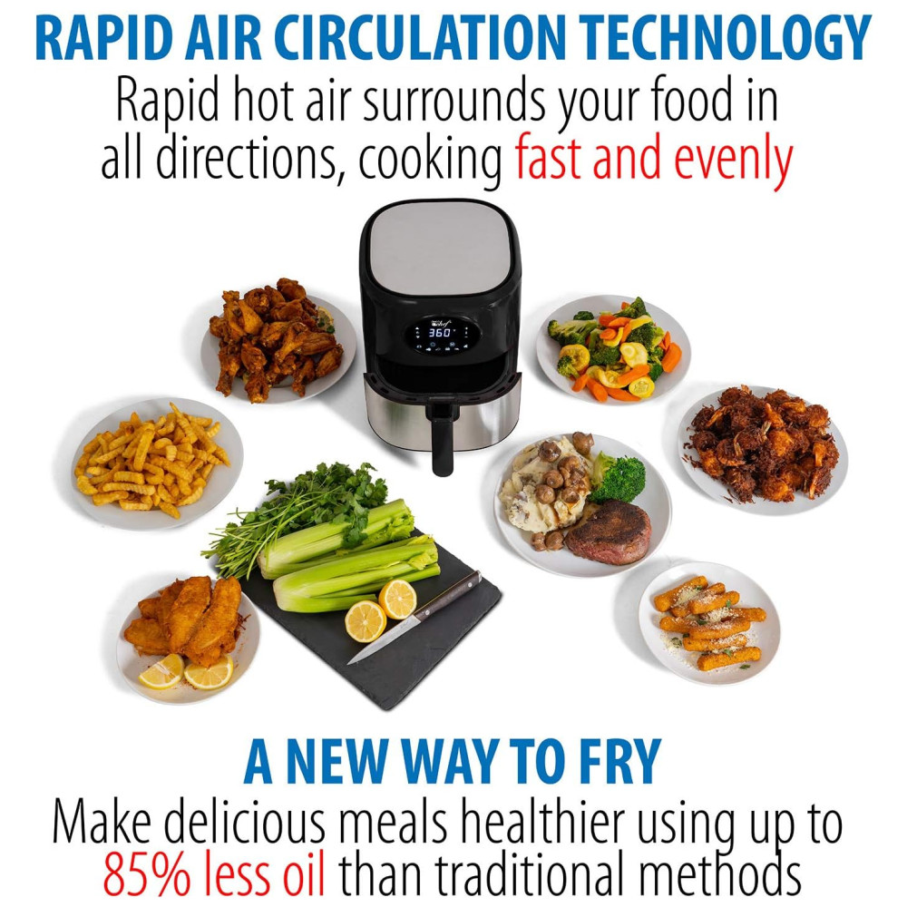 CIRCULAÇÃO DE AR SUPERAQUECIDO Combine uma culinária saudável e resultados rápidos com a Fritadeira de Ar Digital Deco Chef 3.5 L Usando ar superaquecido de circulação rápida, cozinhe sua comida rápida e uniformemente, com pouco ou nenhum óleo. Do café da manhã à sobremesa, crie pratos com menos calorias em comparação com a fritura clássica, sem sacrificar o sabor
