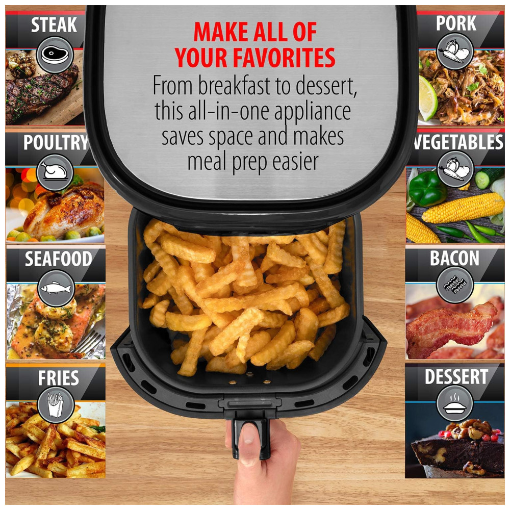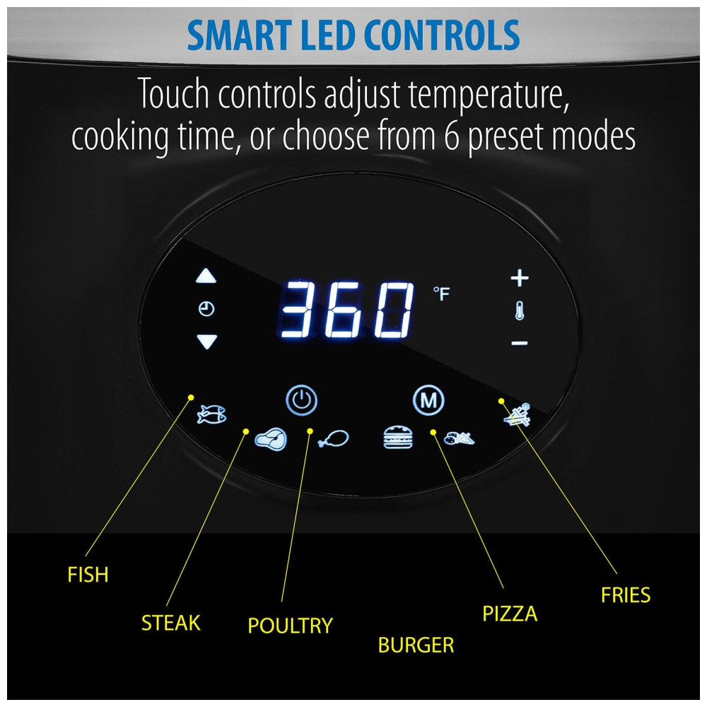 CONTROLES INTELIGENTES Com um painel de controle de toque LED fácil de usar, controle a temperatura, o tempo de cozimento e escolha entre 6 modos de cozimento predefinidos diferentes que incluem Peixe, Bife, Frango, Hambúrgueres, Batatas Fritas Caseiras e Batatas Fritas Congeladas.
