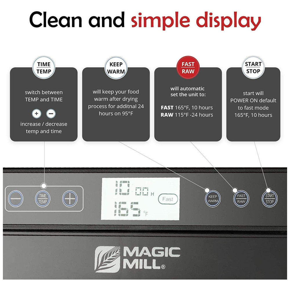O desidratador Magic mill foi projetado para atendê lo com tudo o que você precisa para ter a alegria de hidratar os alimentos para sua saúde e sabor DISTRIBUIÇÃO ÚNICA DE CALOR SECOS ALIMENTARES MESMO NÃO É NECESSÁRIO GIRAR BANDEJAS A máquina de desidratação elétrica é equipada com uma secagem montada na parte traseira tecnologia de circulação de fluxo de ventilador e ar para promover uma secagem uniforme, o uso de apenas bandejas superior ou inferior funcionará muito bem com o calor da distribuição
