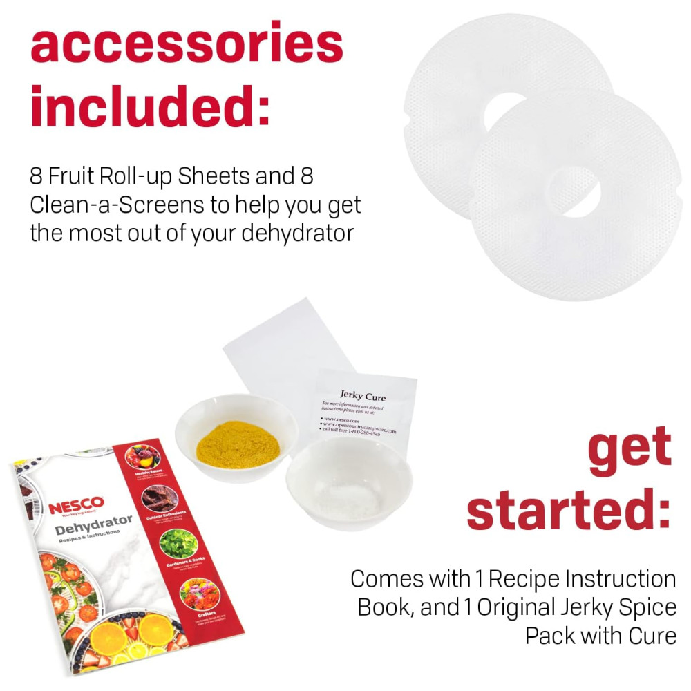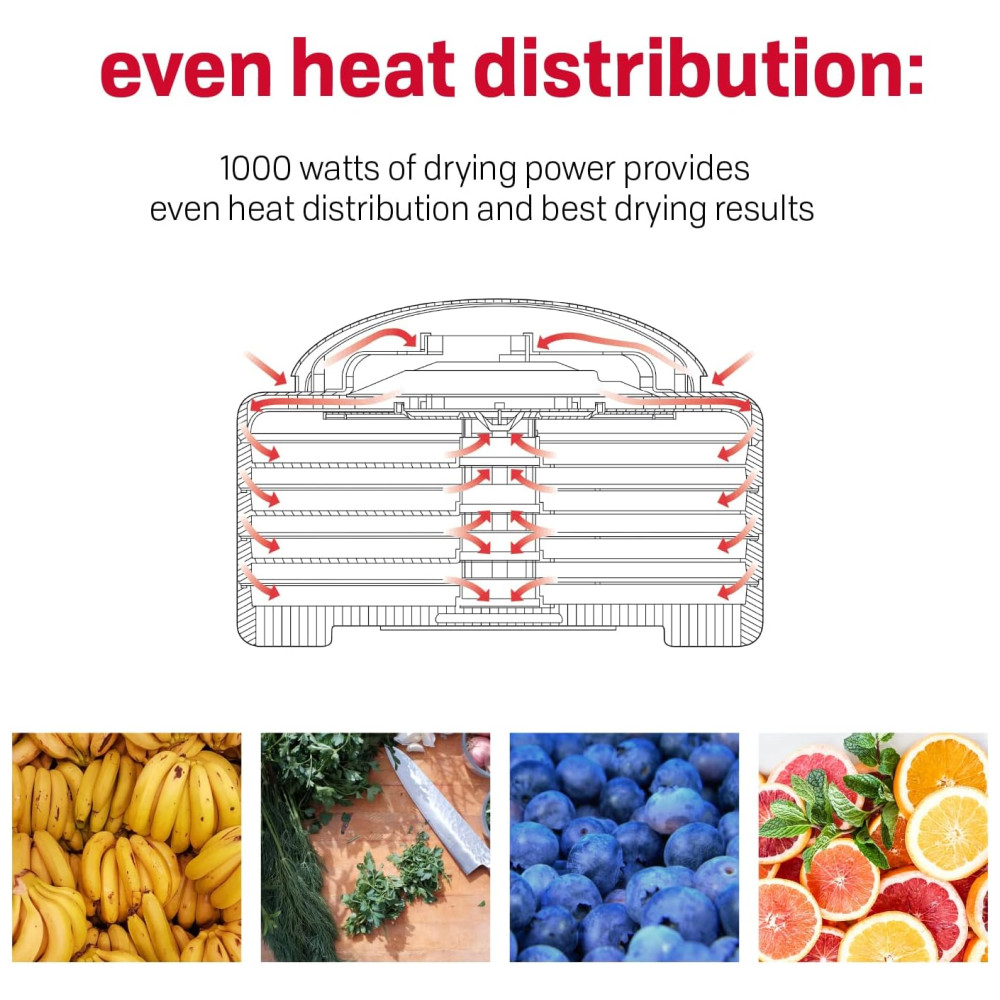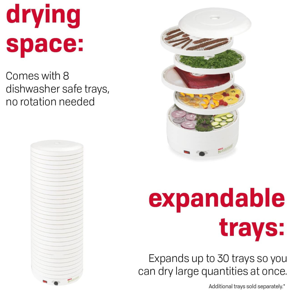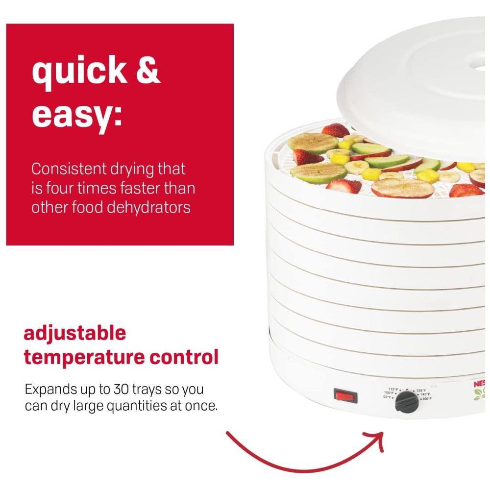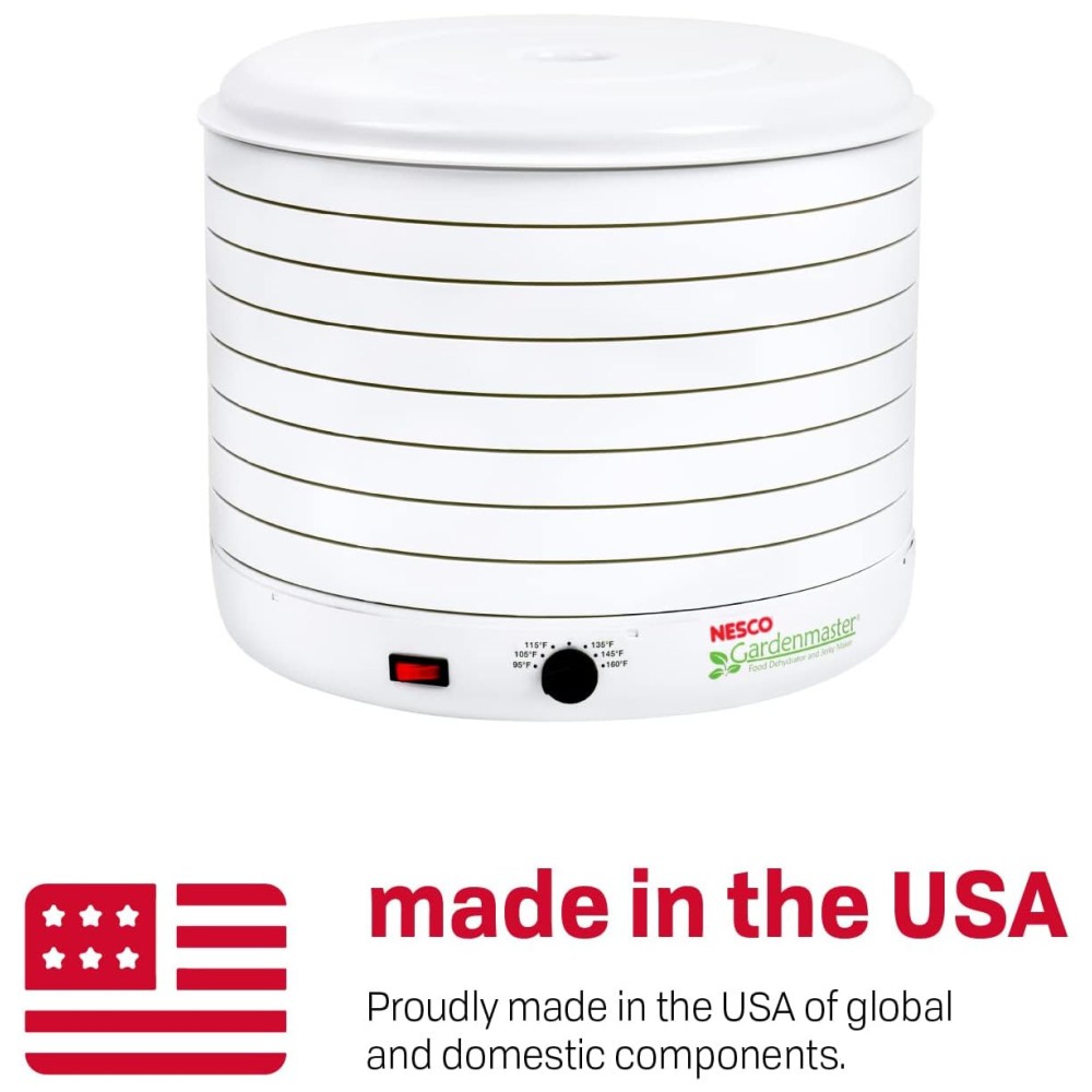 O desidratador de alimentos NESCO FD 1018A Gardenmaster Pro é a nossa unidade topo de linha mais potente e maior do que qualquer outro. 1000 watts de potência de secagem significa que você pode secar mais e mais rápido. Este desidratador vem com oito bandejas 39cm de diâmetro e expande até 30 bandejas para que você possa secar grandes quantidades de uma vez, sem a necessidade de rotação da bandeja. Add A Trays adicionais vendidos separadamente. O controle de temperatura ajustável 35C 71C oferece flexibilidade para obter os melhores resultados ao secar alimentos diferentes que precisam de ajustes de temperatura variados. O silencioso e poderoso ventilador Converga Flow força o ar aquecido para cima na câmara pressurizada externa e, em seguida, horizontalmente em cada bandeja individual. O fluxo de ar então converge no centro para uma secagem rápida e consistente que é quatro vezes mais rápida do que outros desidratadores. Inclui oito folhas de rolo de frutas, oito telas limpas, uma amostra de tempero e cura para carne seca para começar e um livro de receitas e instruções. O desidratador NESCO FD 1018A Gardenmaster Pro Food fornece o poder de secagem que gera velocidade e qualidade máximas para desidratar suas frutas, vegetais, ervas e carne seca favoritos