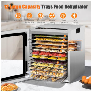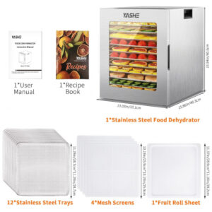 O desidratador de alimentos YASHE oferece 10 programas pré-definidos para frutas, carnes e muito mais, como maçãs, mirtilos, tomates e carne bovina. Você pode personalizar facilmente o tempo 148 horas e a temperatura através do painel de controle LED, tornando-o um desidratador versátil para jerky e vários outros alimentos. Com 12 bandejas ajustáveis em aço inoxidável, este desidratador de carne oferece espaço amplo para secar grandes quantidades de frutas, legumes, carnes e ervas. Seu tamanho generoso o torna o desidratador de frutas e jerky perfeito, garantindo a preservação ideal de nutrientes e sabores. Equipado com um motor de 850W e potentes ventiladores traseiros, este desidratador utiliza um fluxo de ar de 360 para distribuir uniformemente o calor, eliminando a necessidade de rotacionar as bandejas. Construído com um exterior durável em aço inoxidável, este desidratador de alimentos é projetado para uso a longo prazo. As bandejas livres de BPA e seguras para lava-louças facilitam a limpeza, enquanto a luz interna permite monitorar o processo de secagem, garantindo que seus alimentos permaneçam ricos em nutrientes e perfeitamente desidratados. Este desidratador de alimentos completo inclui 12 bandejas, 4 telas de malha, uma folha para fazer rolinhos de frutas, um livro de receitas e um manual do usuário. Recursos práticos como armazenamento do cabo traseiro, alças laterais e operação silenciosa tornam este desidratador para ervas, jerky e outros alimentos uma adição versátil e confiável para sua cozinha.