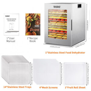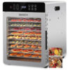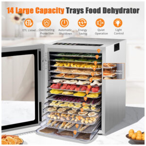 Com capacidade de 14 bandejas ajustáveis em aço inoxidável, este desidratador para jerky permite que você seque grandes lotes de frutas, legumes, carnes e ervas simultaneamente. Sua generosa capacidade é perfeita para porções familiares ou desidratação em grande escala, poupando tempo e esforço. Oferece 10 opções pré-definidas para diferentes alimentos, como maçãs, mirtilos, tomates e carne, permitindo ajustar o tempo de secagem de 1 a 48 horas e a temperatura de 95 a 165°C através do painel de controle LED para desidratação personalizada, ideal para jerky e vários outros petiscos. O potente motor de 850W combinado com ventiladores traseiros e tecnologia de circulação de ar 360 garante uma desidratação uniforme e rápida. A construção robusta em aço inoxidável oferece durabilidade de longa duração, enquanto as bandejas livres de BPA são seguras para lava-louças, garantindo uma limpeza sem complicações. Completo com 14 bandejas, 4 telas de malha, uma folha para preparo de frutas e um livro de receitas, este desidratador de alimentos é um pacote completo para começar a desidratar imediatamente, sendo uma ferramenta versátil para qualquer cozinha.