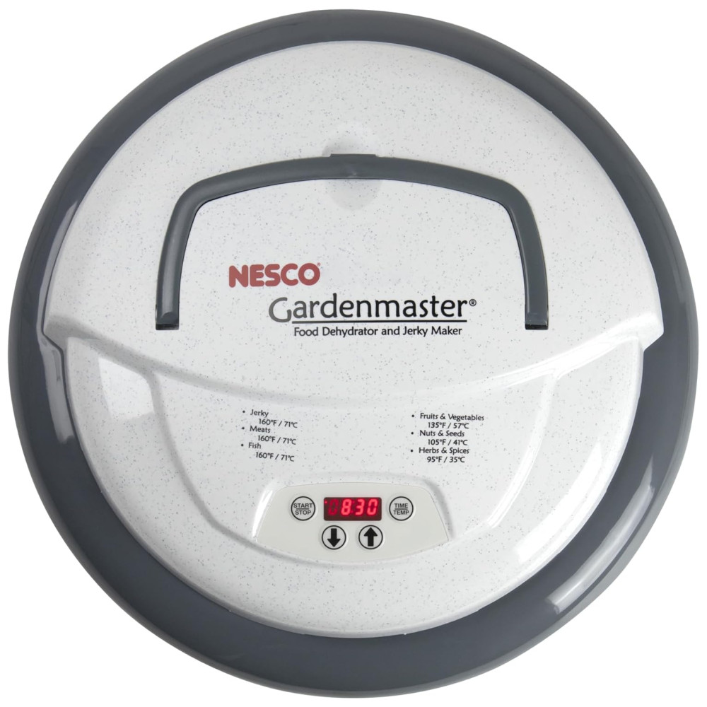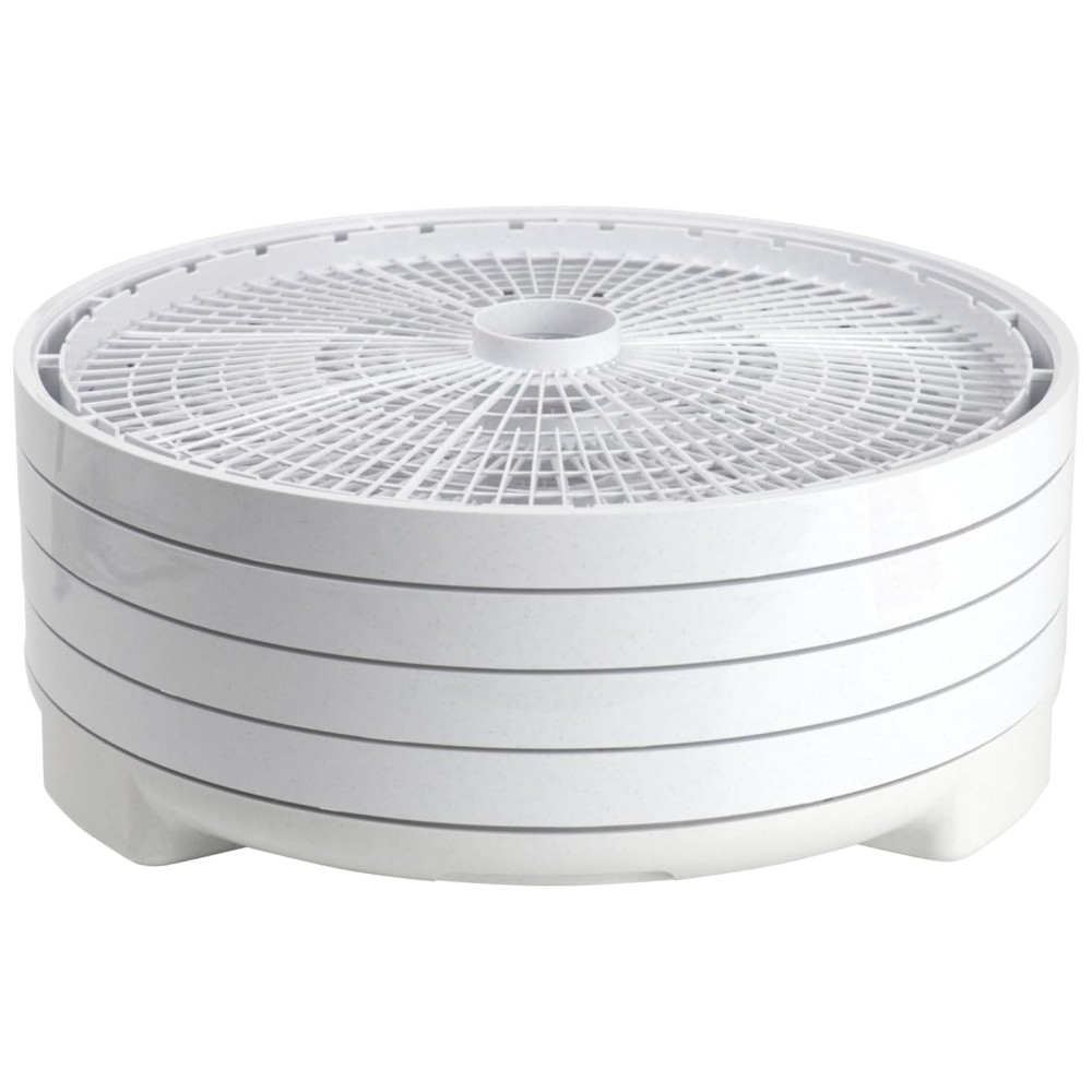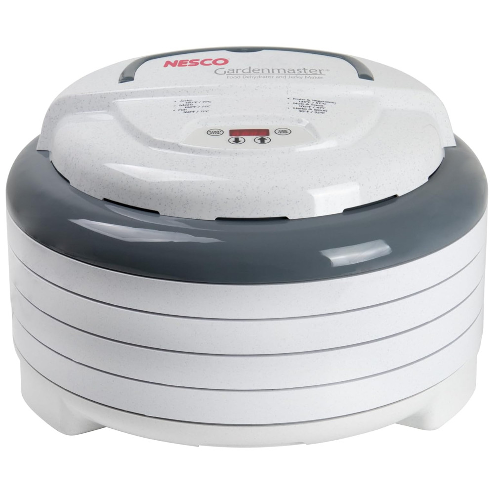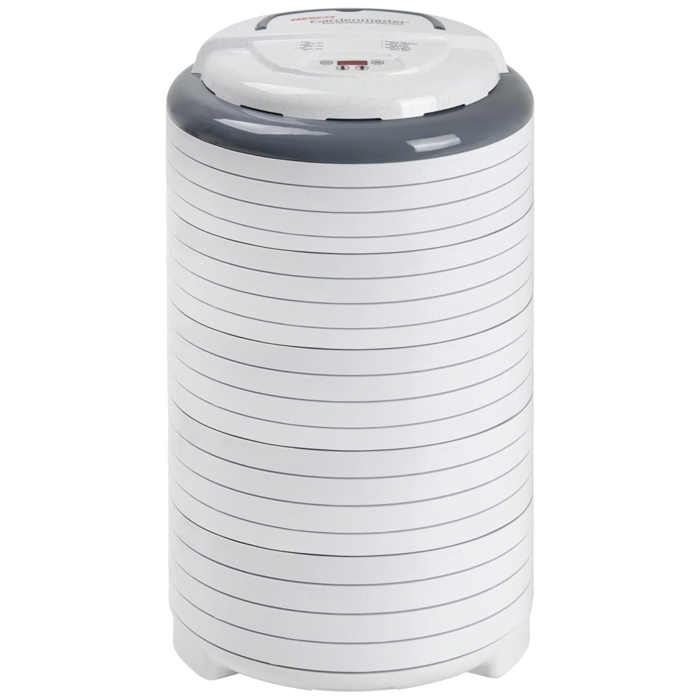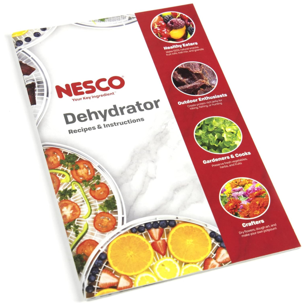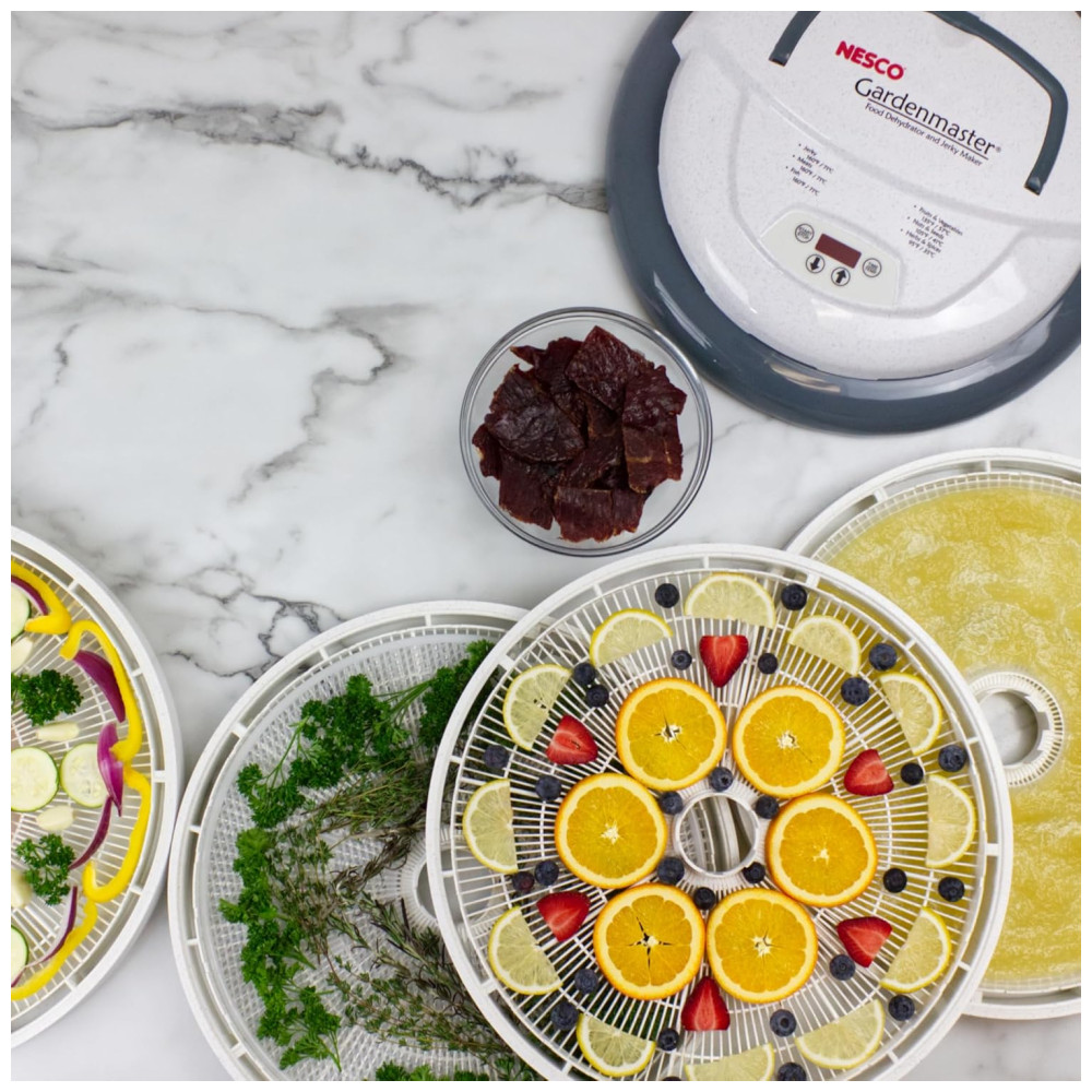 1000 watts de potência de secagem fornecem distribuição uniforme de calor Controle digital ajustável de tempo e temperatura 32 a 70 graus 4 Bandejas sem BPA com 1 pé quadrado de área de secagem por bandeja Expansível para 20 bandejas Orgulhosamente fabricado nos EUA com componentes globais e domésticos inclui 1 folha de rolo de frutas, 1 tela limpa, uma amostra de Jerky Seasoning Cure e um livro de instruções e receitas de 52 páginas.