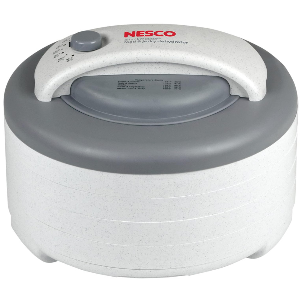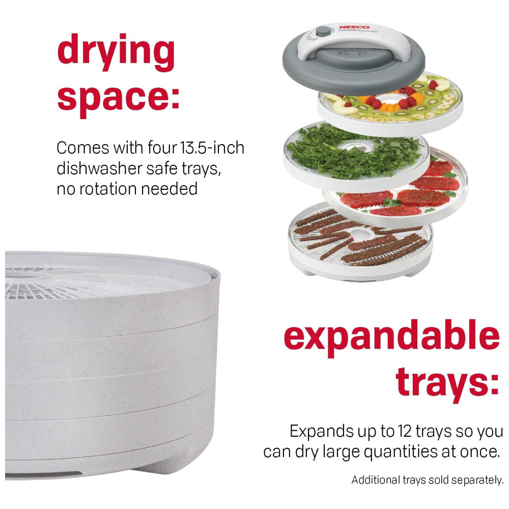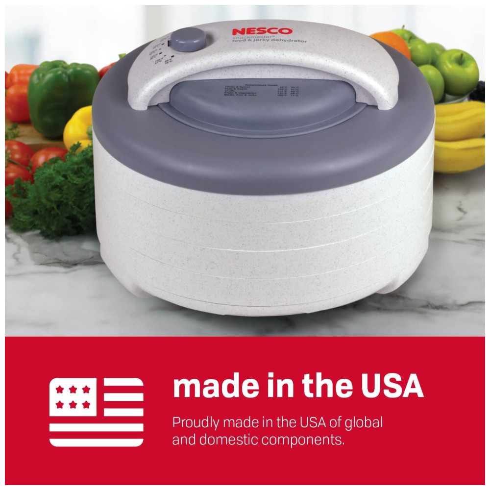 O Desidratador NESCO FD 60 Snackmaster Express tem o poder de secagem que gera velocidade e qualidade máximas para desidratar suas frutas, vegetais, ervas e carne seca preferidos. O silencioso e poderoso ventilador Converga Flow força o ar aquecido para baixo na câmara pressurizada externa e, em seguida, horizontalmente em cada bandeja individual. O fluxo de ar então converge no centro para uma secagem rápida e consistente que é quatro vezes mais rápida do que outros desidratadores. Este desidratador vem com quatro bandejas 34cm de diâmetro e expande até 12 bandejas para que você possa secar grandes quantidades de uma vez, sem a necessidade de rotação da bandeja. Add A Trays adicionais vendidos separadamente. O controle de temperatura ajustável 35 C 71C oferece flexibilidade para obter os melhores resultados ao secar alimentos diferentes que precisam de ajustes de temperatura variados. O NESCO FD 60 Snackmaster Express oferece uma maneira fácil e econômica de preparar batatas fritas nutritivas e deliciosas com carne seca e lanches de frutas totalmente naturais em casa.