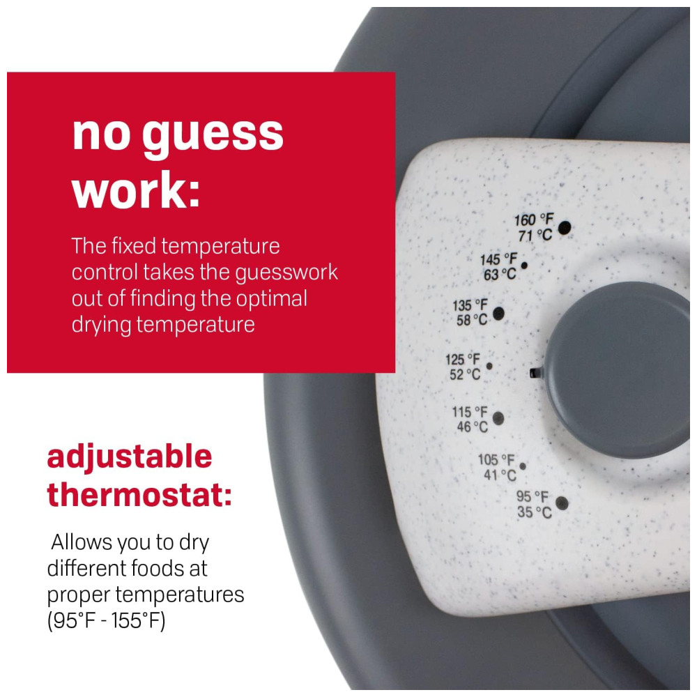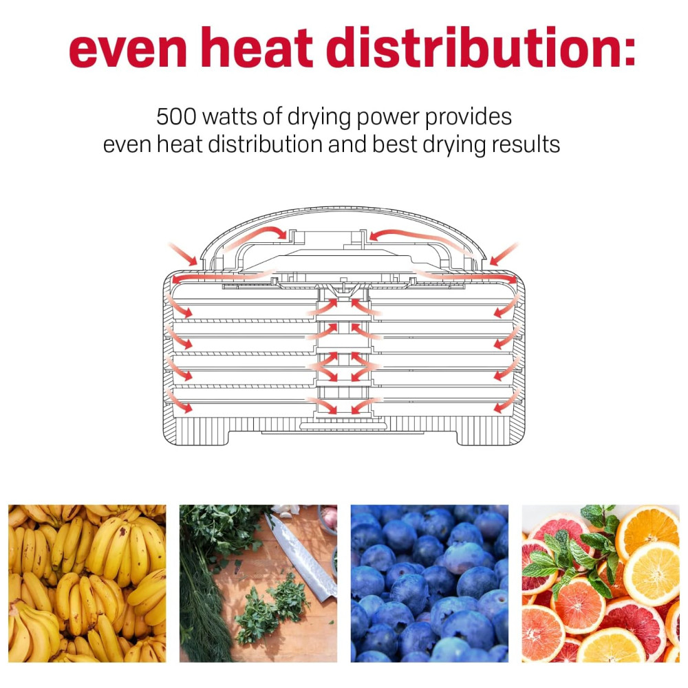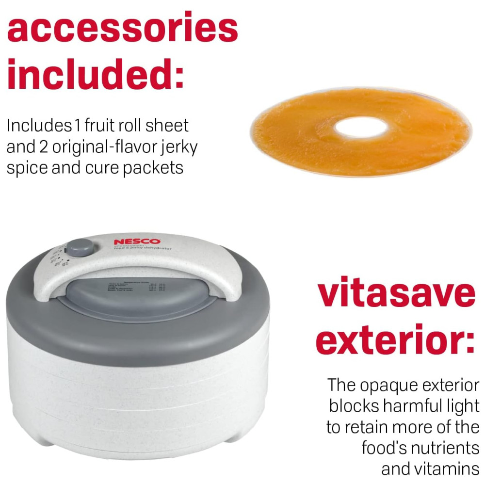 O desidratador de alimentos com 4 bandejas de 500 watts seca em horas em vez de dias e o exterior opaco com vita save ajuda a bloquear a luz prejudicial que destrói o conteúdo nutricional dos alimentos que estão sendo desidratados.