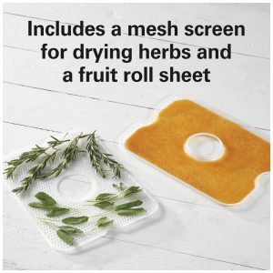 Inclui uma folha de malha fina para secar pequenos alimentos como ervas e uma folha sólida para fazer rolos de frutas
