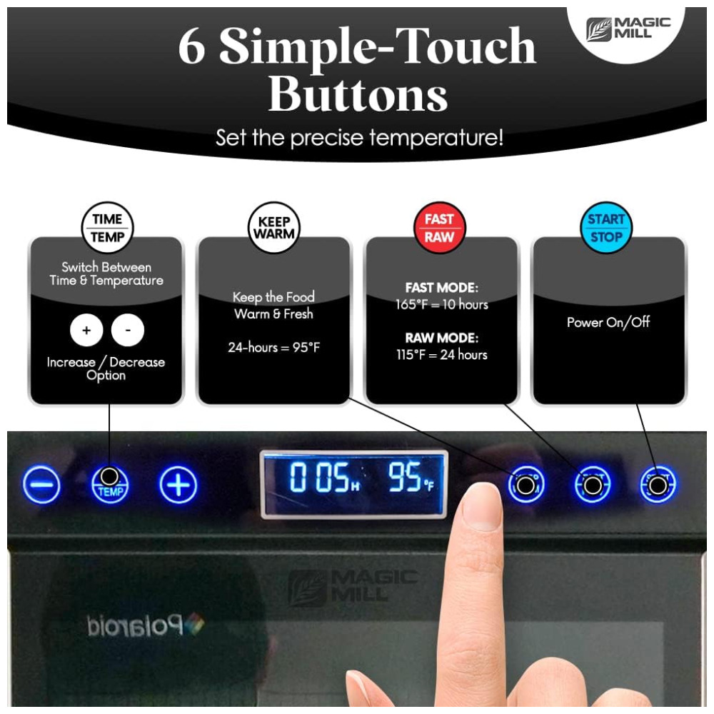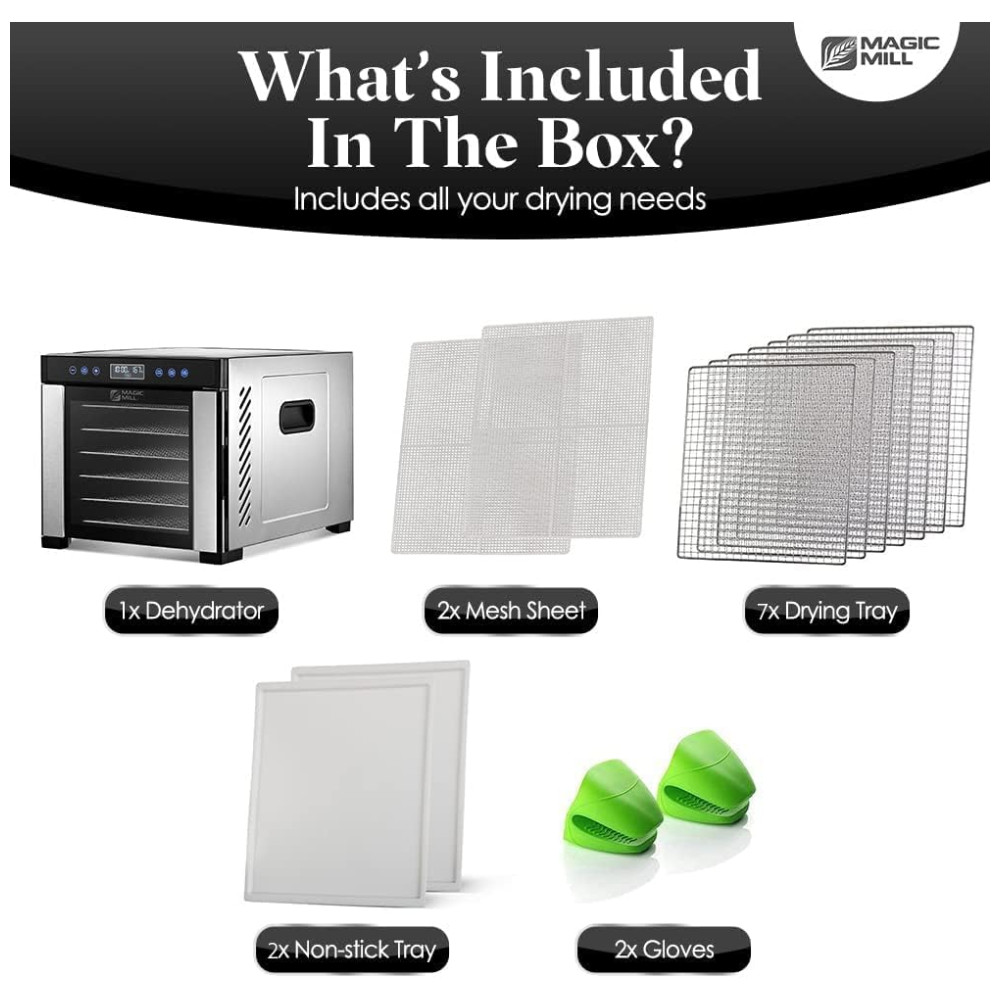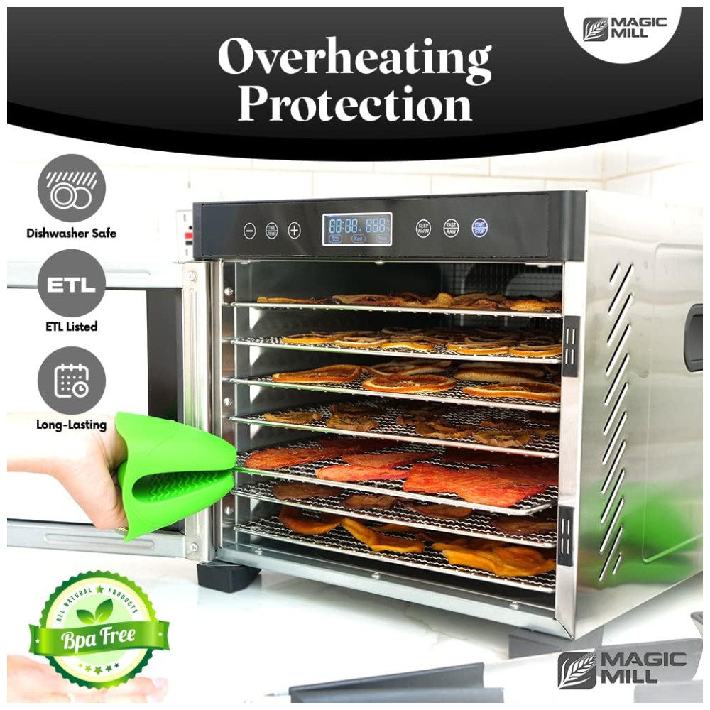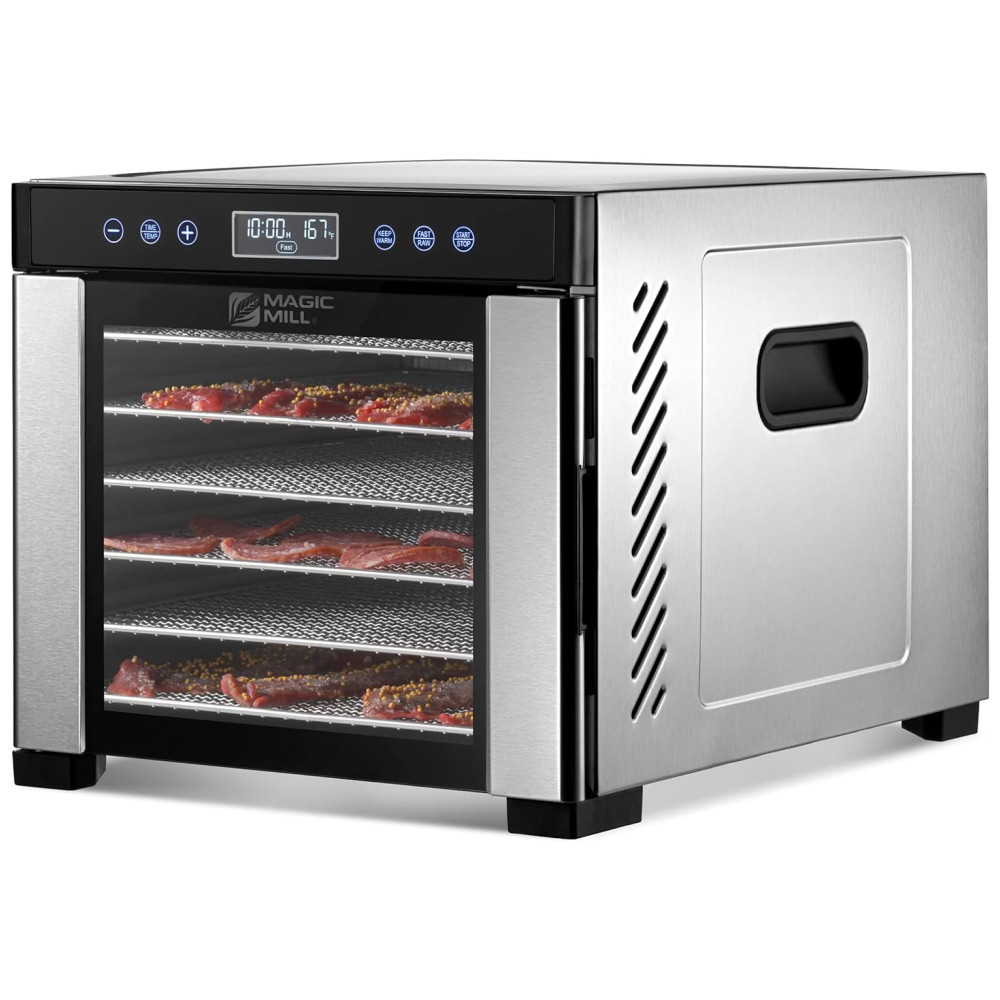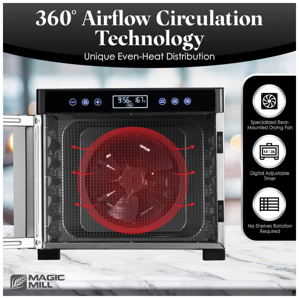O desidratador Magic Mill Pro é um equipamento robusto e eficiente, ideal para desidratar uma ampla variedade de alimentos como jerky, frutas, ervas, carnes e petiscos para animais de estimação. Com potência de 600 watts, conta com tecnologia de circulação de ar por ventilador traseiro, que proporciona secagem uniforme sem necessidade de rodar as bandejas, otimizando o processo e garantindo resultados consistentes.