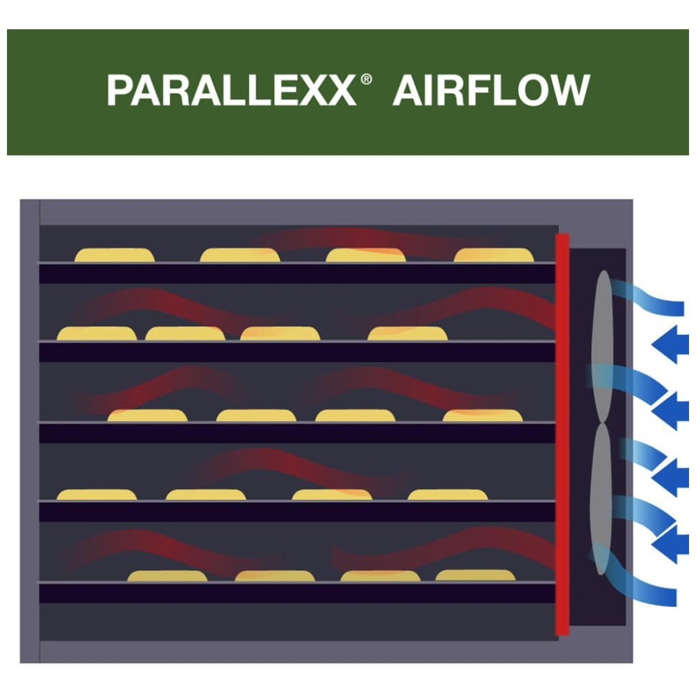 PATENTEADO O Parallex Horizontal Airflow é exclusivo da Excalibur e ajuda os alimentos a desidratarem mais rapidamente, reterem mais nutrientes e parecerem e terem melhor sabor, sem rotação da bandeja.