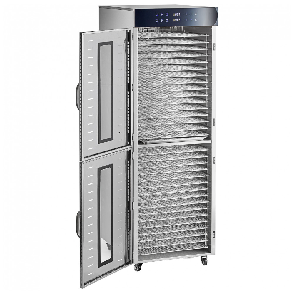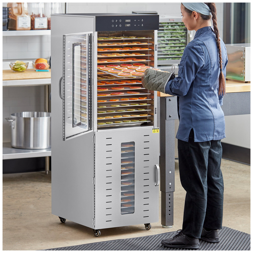 O desidratador de alimentos Avantco LT105 em aço inox oferece capacidade para 32 bandejas removíveis, ideal para desidratação em escala média em açougues, lojas especializadas e estabelecimentos de alimentos saudáveis. Equipado com conexão elétrica de 220V e potência de 3000W, processa jerky, granola, frutas, massas e vegetais em ambiente controlado. A faixa de temperatura ajustável de 30°C a 90°C atende diferentes requisitos de secagem, com timer de até 24 horas para operação contínua.