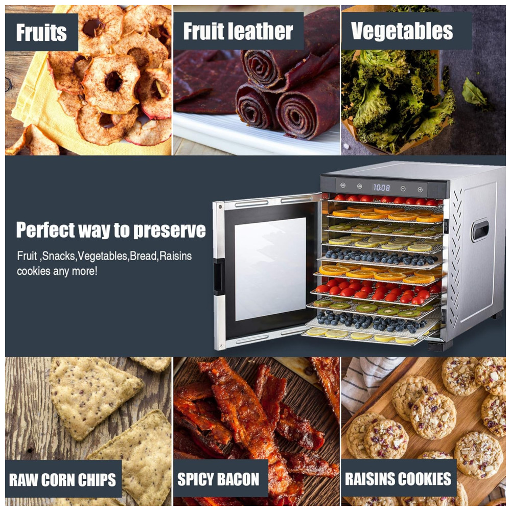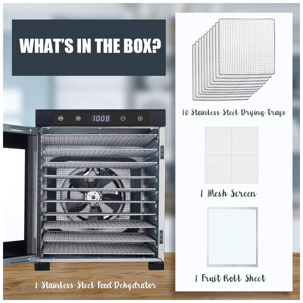 BANDEJAS SECADORAS DE 10 NÍVEIS Vem com 10 bandejas de aço inoxidável de qualidade alimentar ou rack de secagem. Também pode ser para secar alimentos sem o uso do desidratador. Como as bandejas são removíveis, são muito fáceis de limpar. Também inclui tela de malha e folha de rolo de frutas
