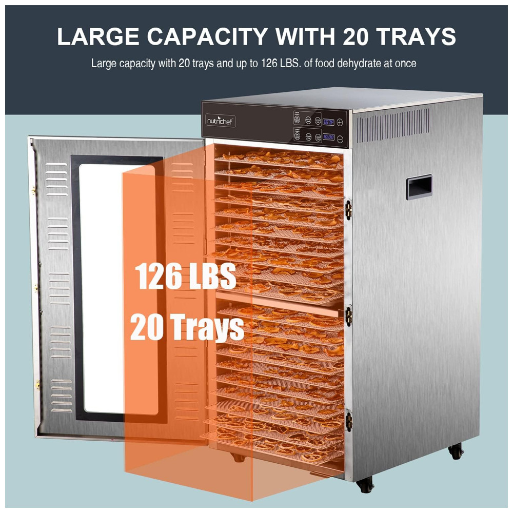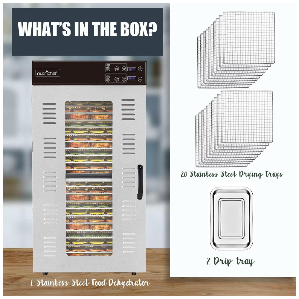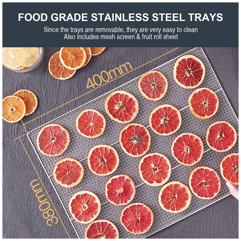 BANDEJAS DE SECADOR DE 20 NÍVEIS Vem com 20 bandejas de aço inoxidável de qualidade alimentar ou rack de secador. Também pode ser para secar alimentos sem o uso do desidratador. Como as bandejas são removíveis, elas são muito fáceis de limpar. Também inclui tela de malha e folha de rolo de frutas
