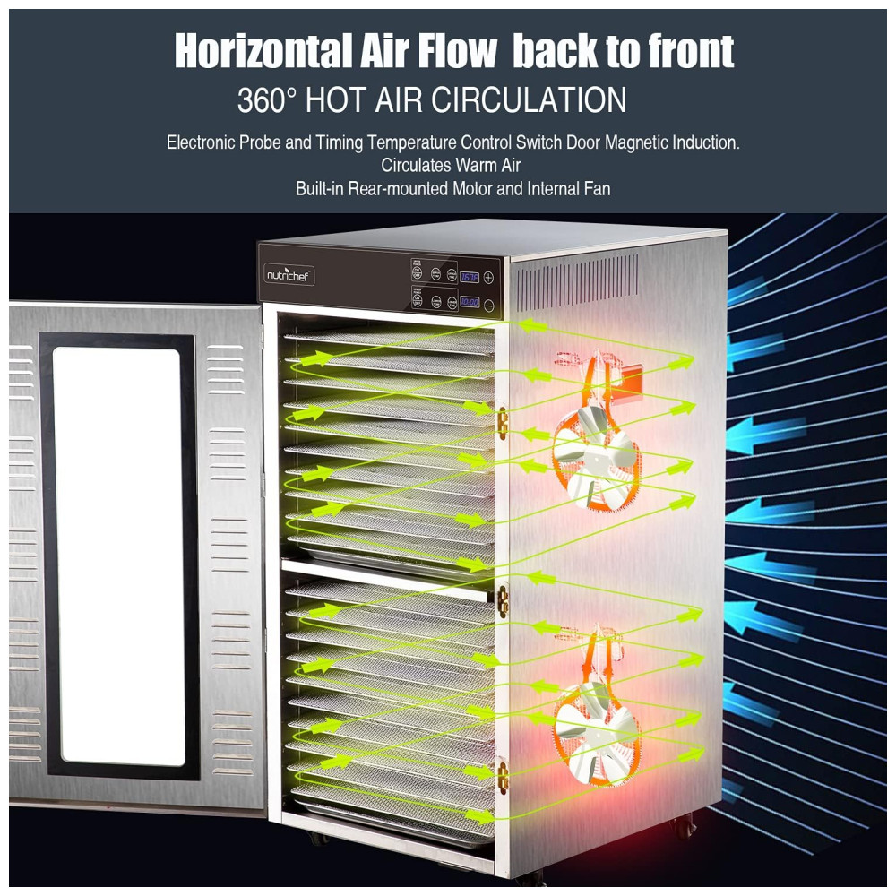 CIRCULAÇÃO DE ALTO CALOR A circulação de ar quente de 360 seca efetivamente os alimentos, removendo o conteúdo de umidade. Ele encolhe os alimentos, mas ainda retém 97 das vitaminas e minerais. Testado cientificamente para aumentar a vida útil dos alimentos com alta circulação de calor