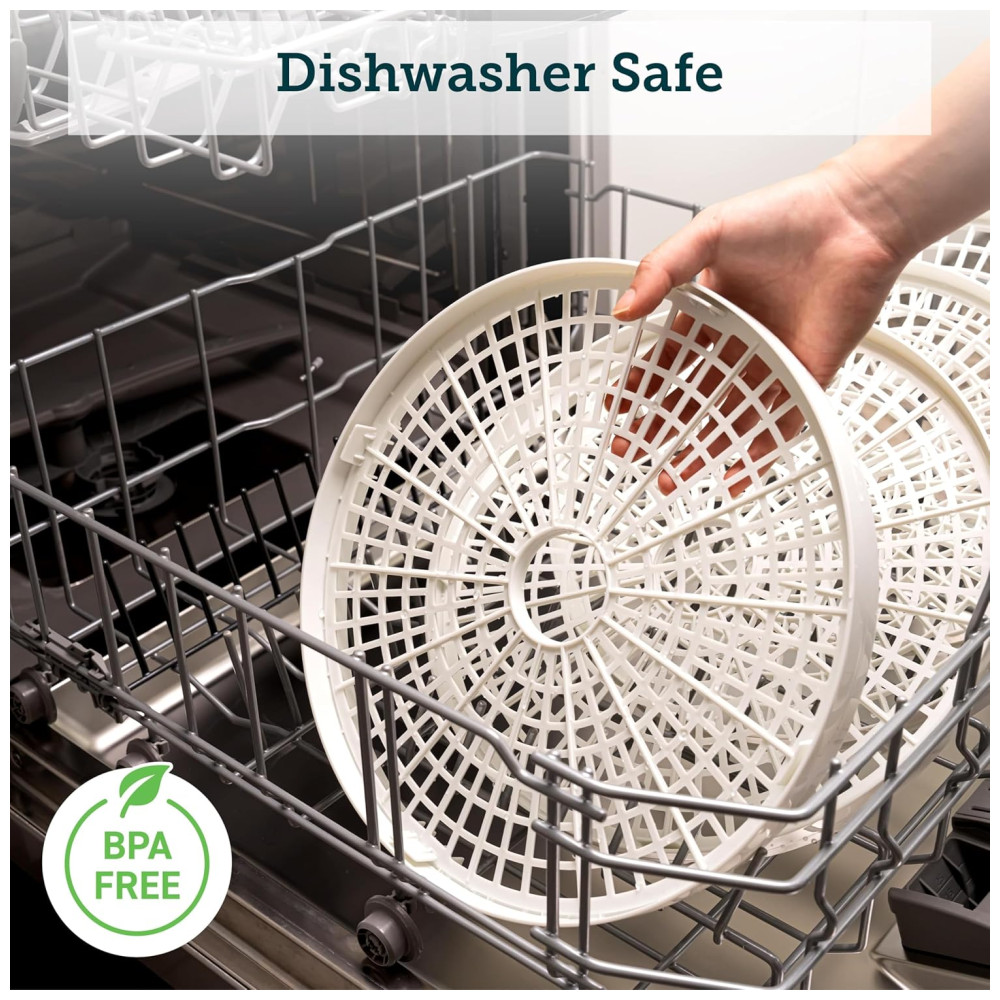 Fácil de Limpar A base do desidratador pode ser limpa com pano úmido ou esponja. As 5 bandejas podem ser colocadas no rack superior da máquina de lavar louça para facilitar a limpeza. Lembre se de remover as bandejas antes do início do ciclo de secagem.