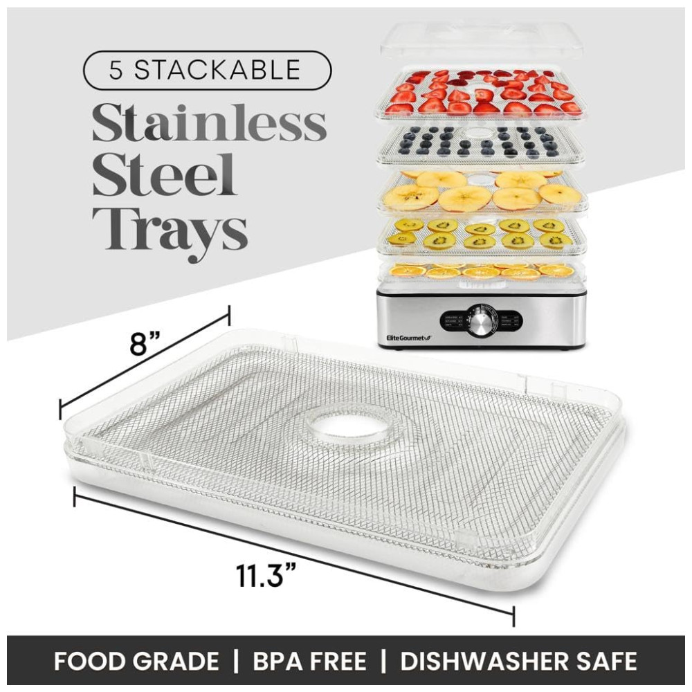 Desidratador de alimentos de 5 bandejas de aço inoxidável, 5 bandejas de aço inoxidável de malha, tampas e laterais de plástico sem BPA, base de aço inoxidável