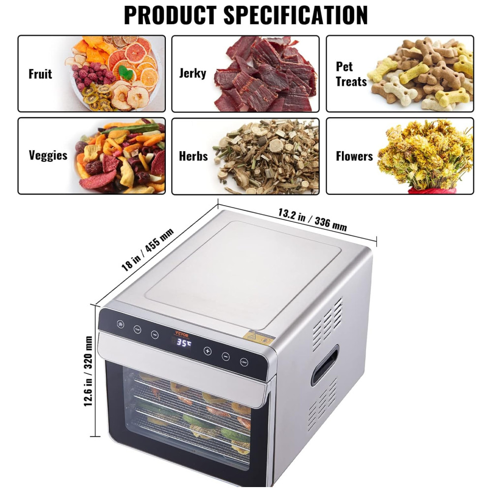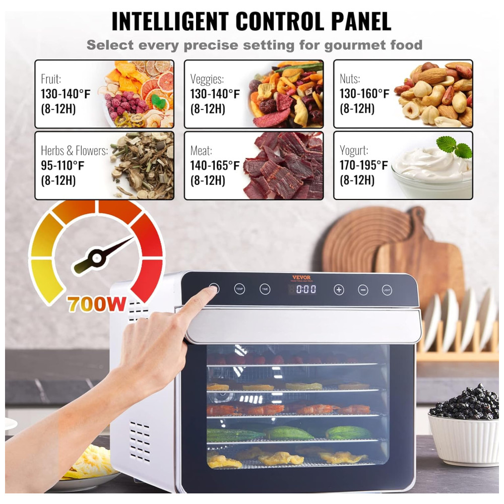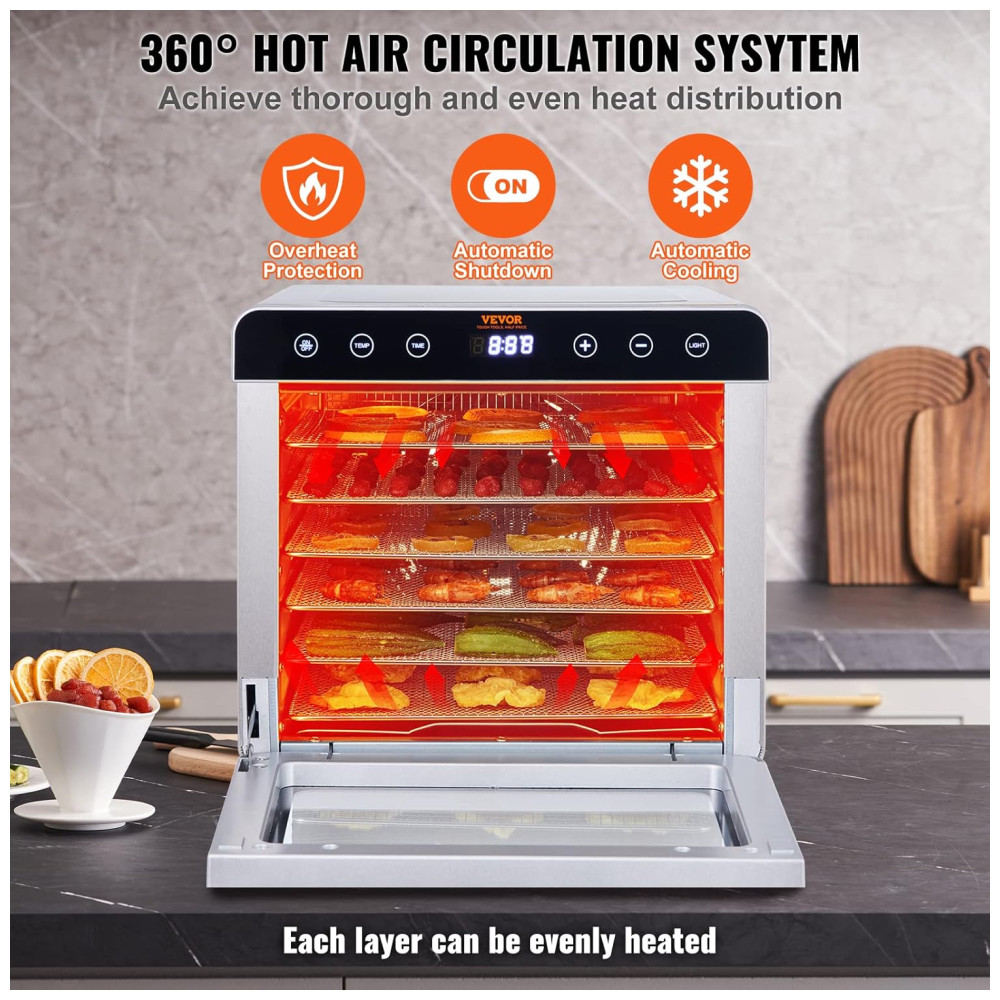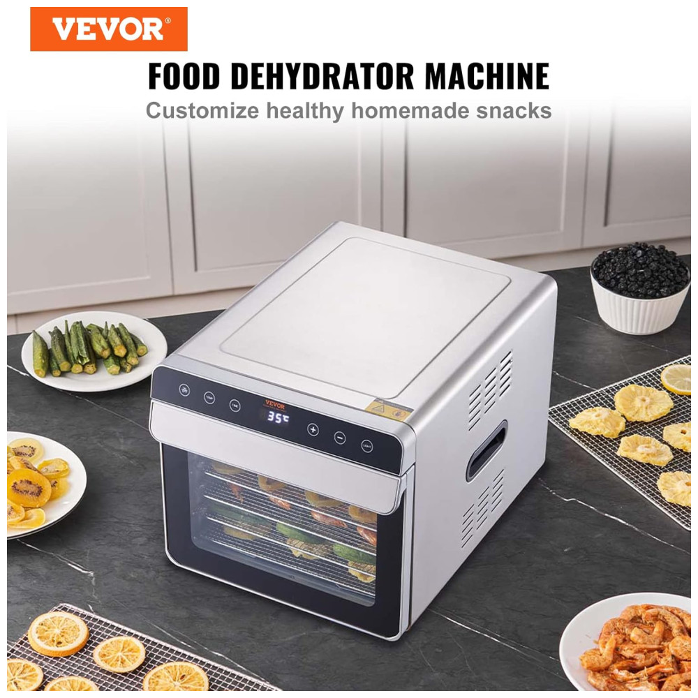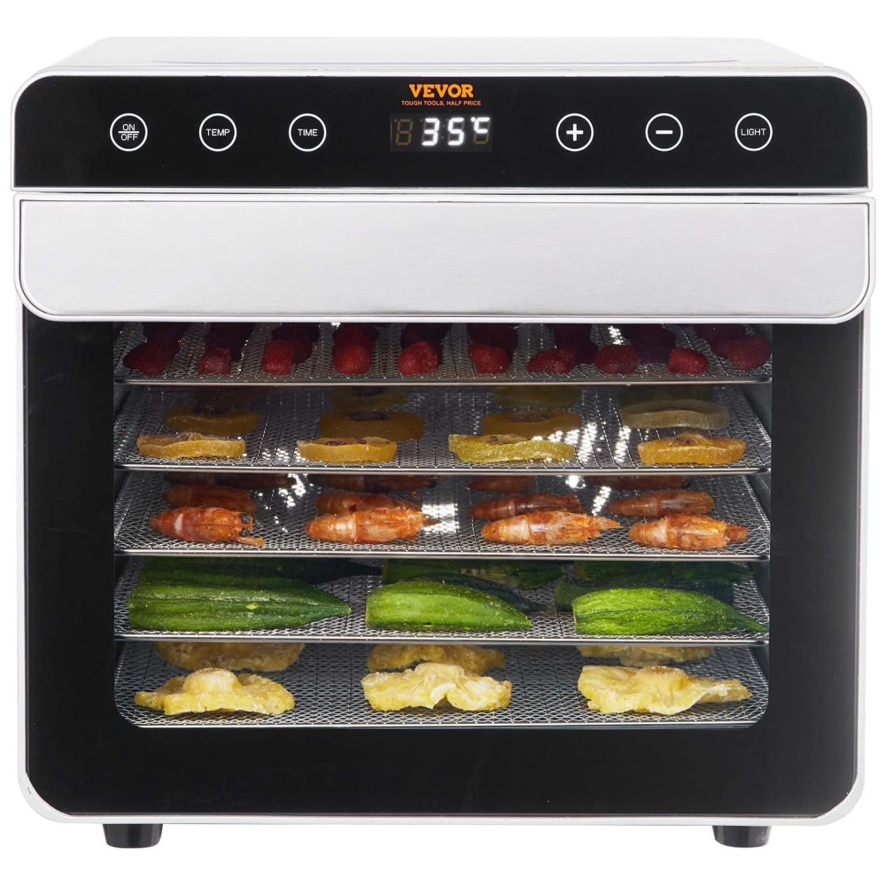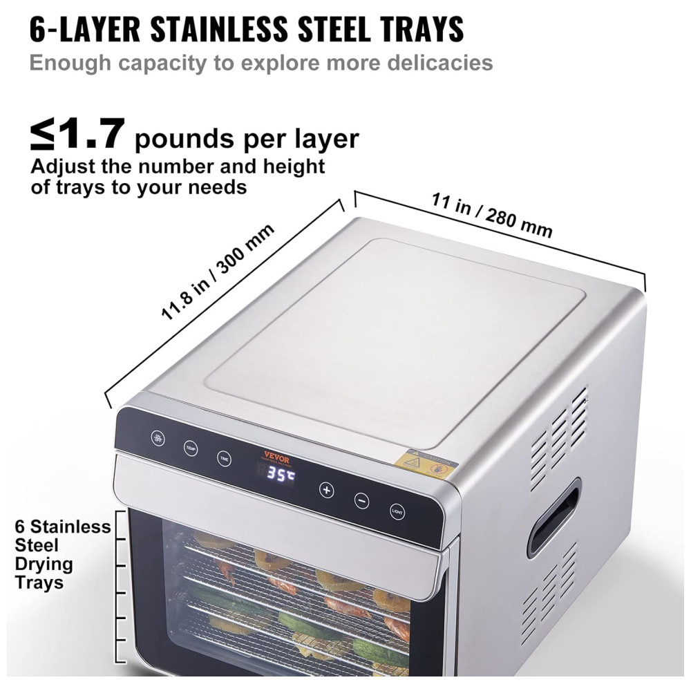 Bandejas de Aço Inoxidável de 6 Camadas: Este desidratador de alimentos possui seis bandejas de aço inoxidável feitas de grau alimentício 304, cada uma medindo 300 x 280 milimitros. Cada camada pode acomodar até 1,7 quilos de comida, permitindo que você desidrate diferentes tipos de frutas e vegetais de uma só vez.