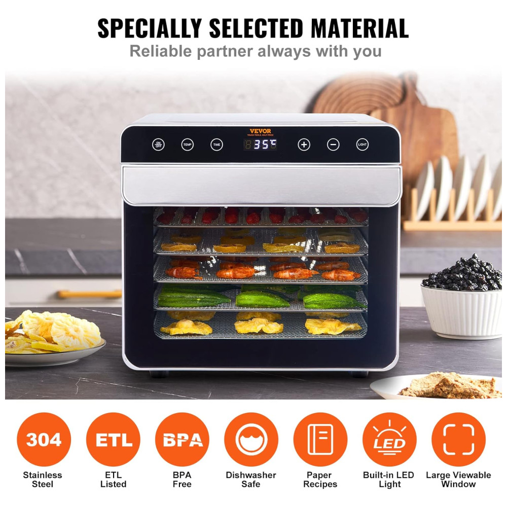 Material especialmente selecionado: Nossa máquina desidratadora é certificada pela ETL e fabricada em aço inoxidável 201 durável e resistente à corrosão. As bandejas são de aço inoxidável 304 de alta qualidade, livres de BPA e seguras para lavar na máquina de lavar louça. A máquina também possui uma luz LED embutida e uma grande janela de visualização, permitindo que você observe facilmente sua comida enquanto ela seca.