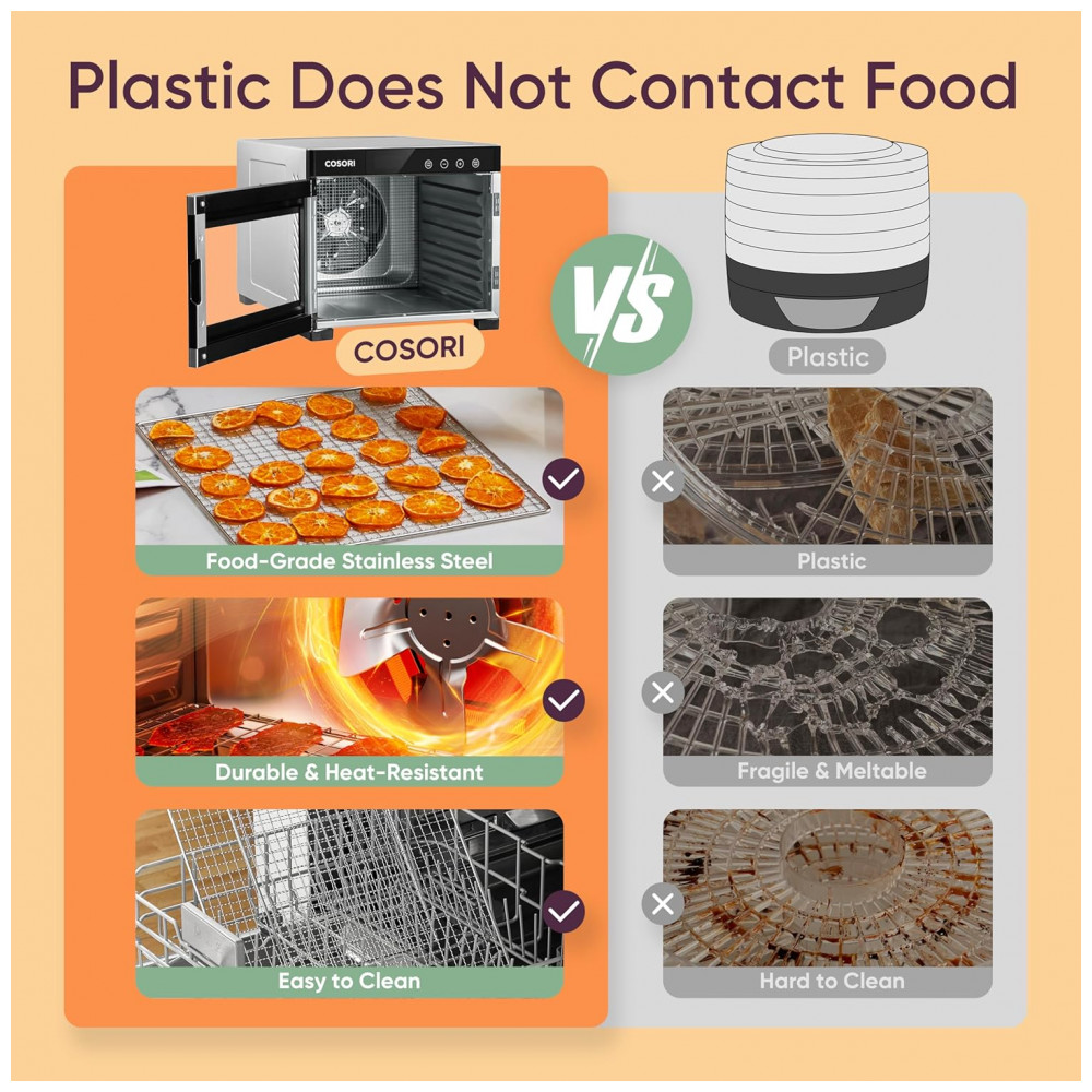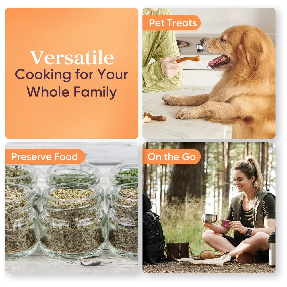 Materiais s e duráveis com um exterior elegante feito de aço inoxidável durável e de qualidade alimentar, o desidratador foi construído para durar. Sua compra vem com 6 bandejas de aço inoxidável laváveis.