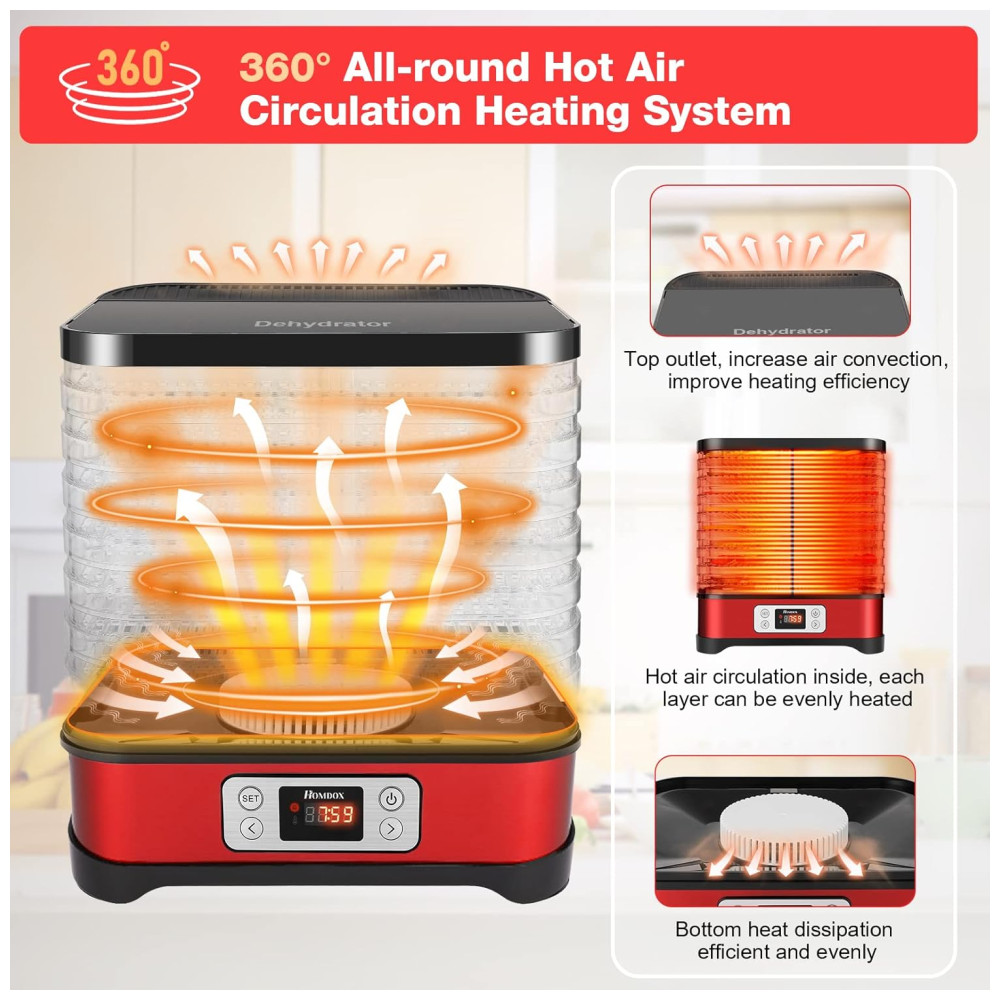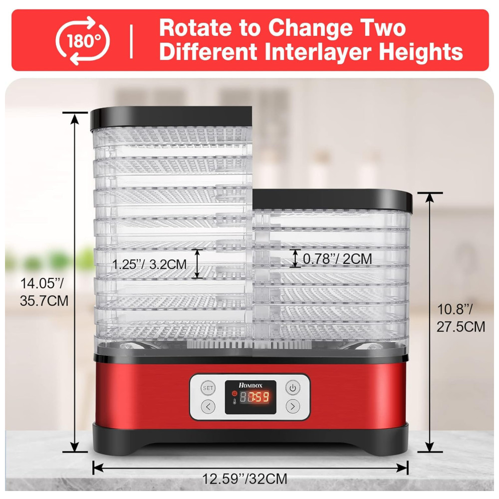 Com 8 bandejas empilháveis e flexíveis, que giram 180 graus para diferentes alturas, este desidratador oferece grande capacidade e secagem uniforme para que todos os seus alimentos sequem uniformemente. O sistema de fluxo de ar e ventilador montado na parte inferior garantem uma secagem ideal.