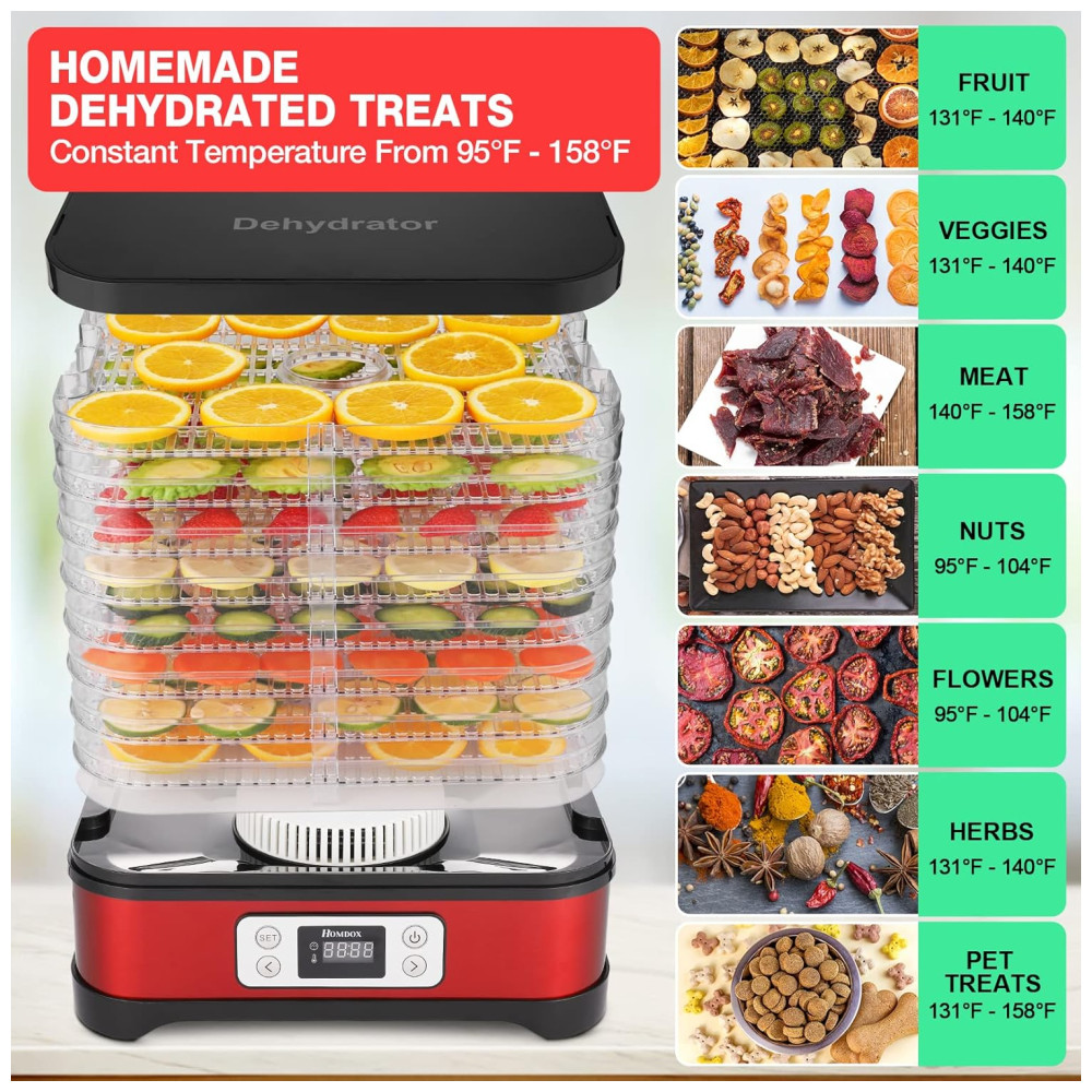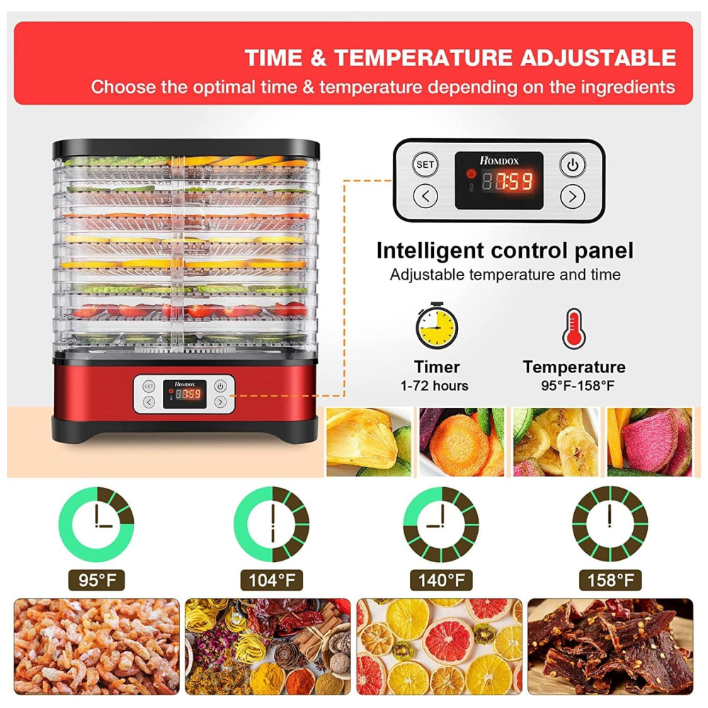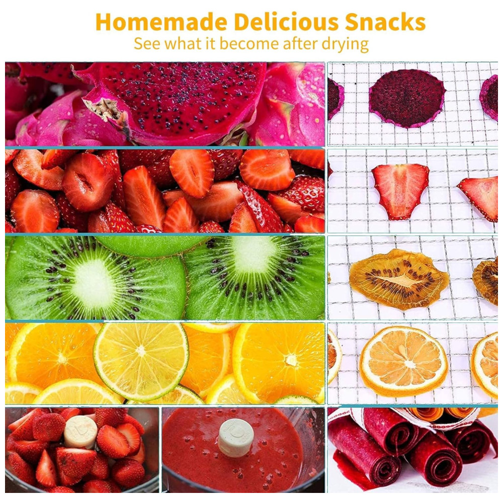 Com tempo preciso e controle de temperatura, você pode secar diferentes tipos de alimentos em temperaturas apropriadas e precisas, variando de 95 a 158F 35 70C por até 72 horas. Além disso, este desidratador é multifuncional, podendo serpara secar flores, potpourri ou artesanato em massa, além de carne de animais de estimação.