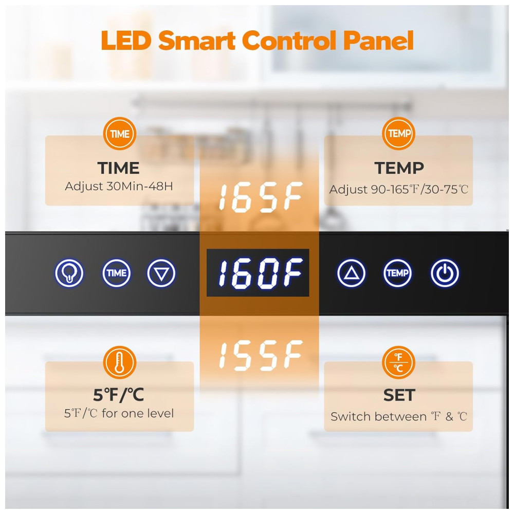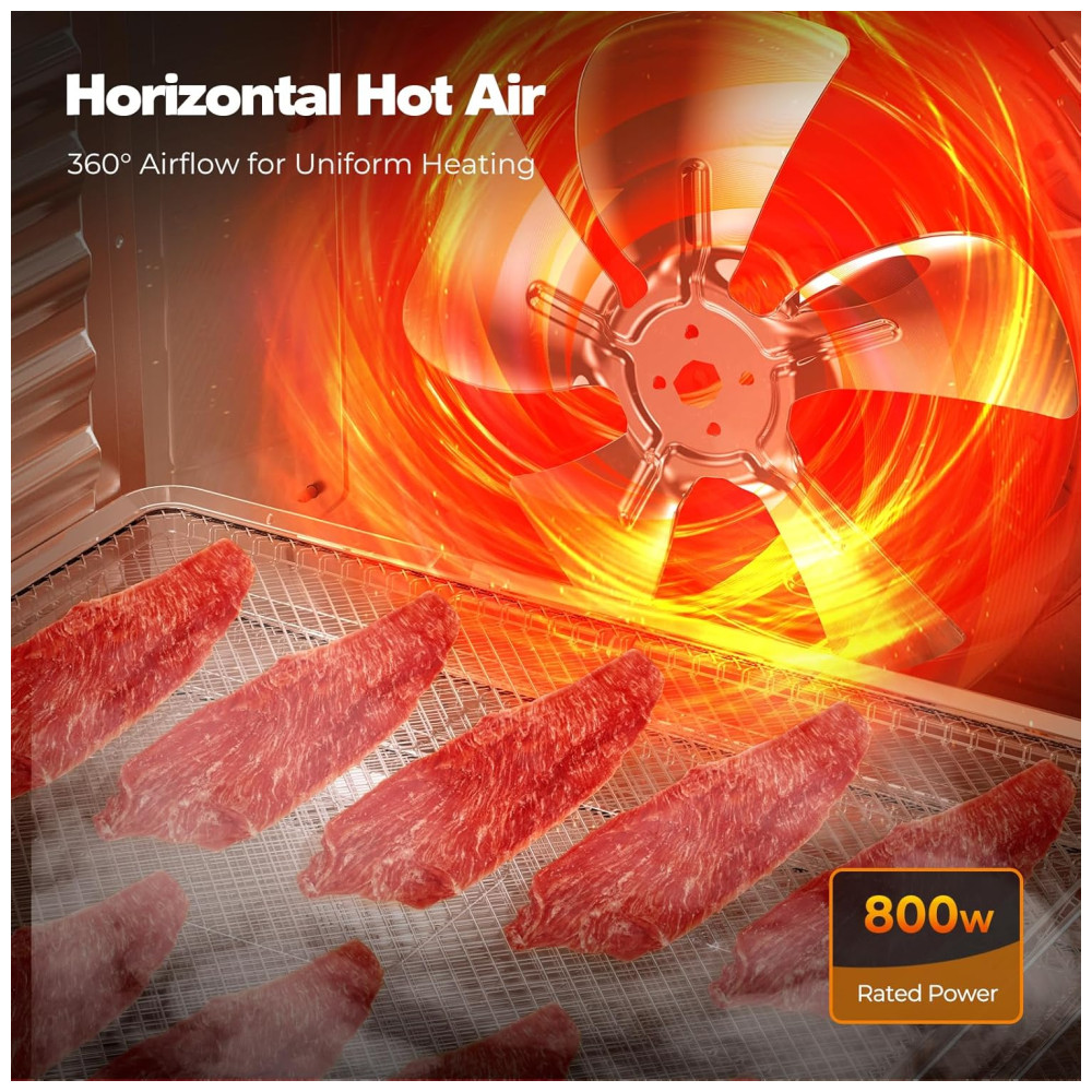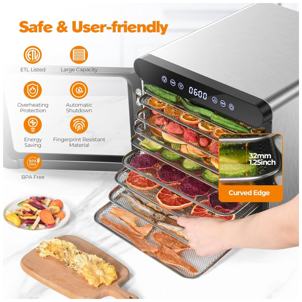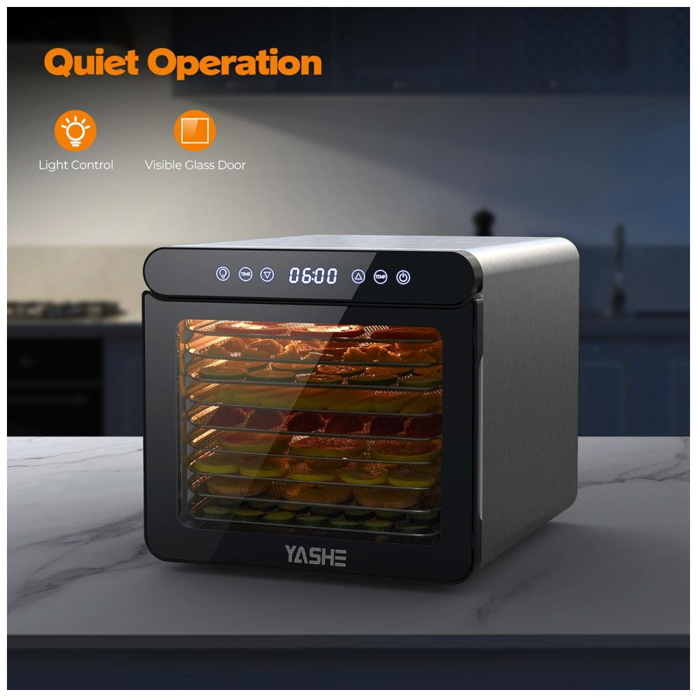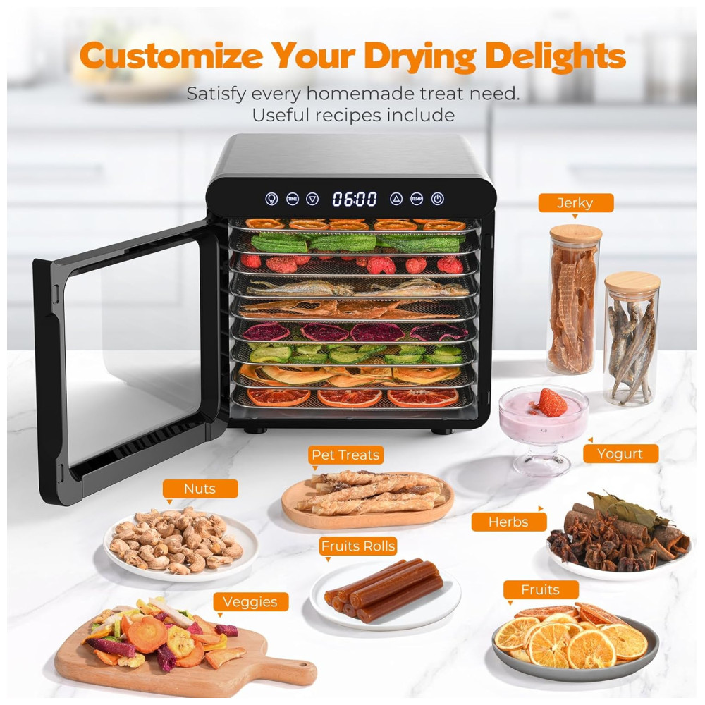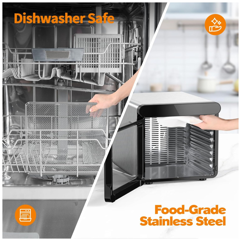 Com baixo nível de ruído, é possível ter uma experiência tranquila de secagem de lanches caseiros. O desidratador é feito com aço inoxidável de qualidade alimentar, possui 9 bandejas próprias para lava louças para fácil limpeza e uma porta transparente que adiciona um toque moderno. Com design atraente e moderno, possui uma grande porta de vidro que trava para fácil monitoramento, além de proteção contra superaquecimento que é ativada se necessário, garantindo a segurança, e desliga automaticamente quando o cronômetro termina.