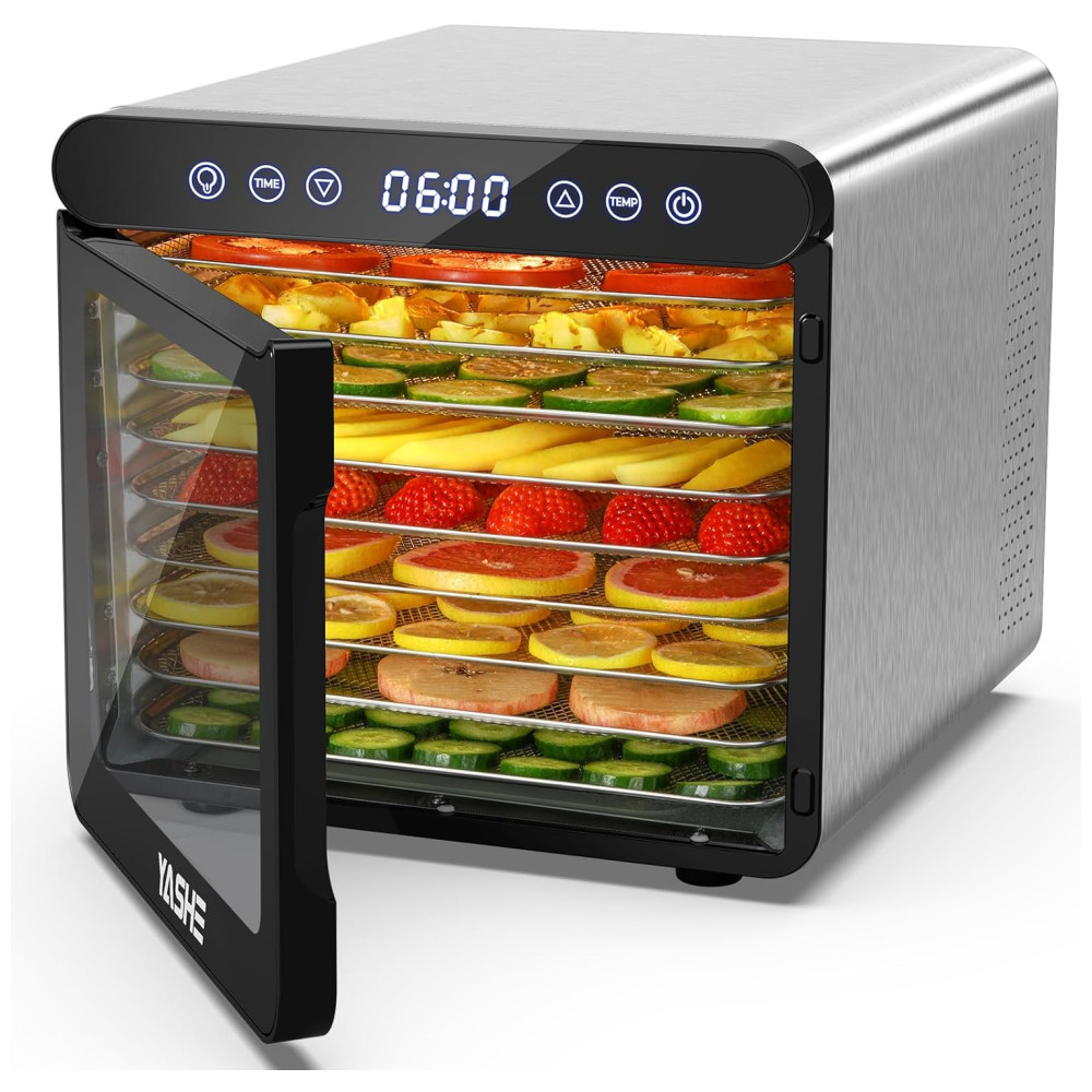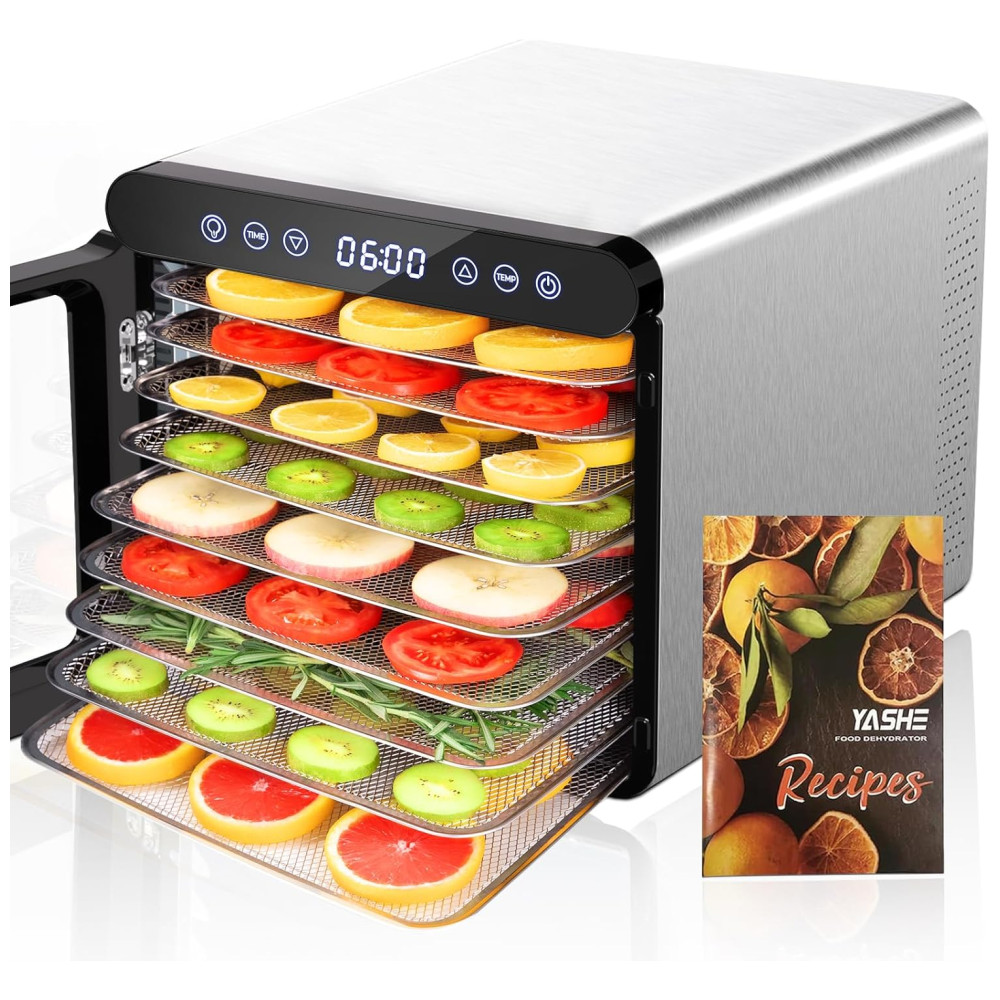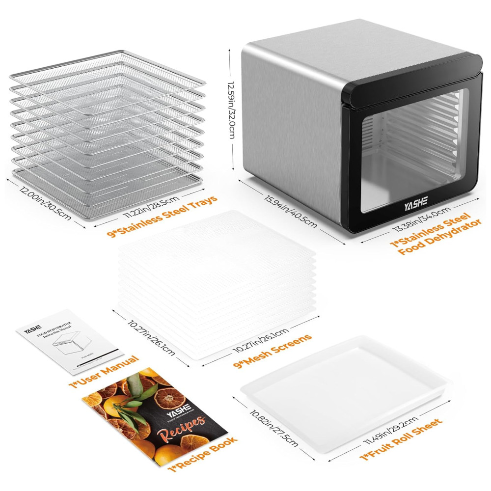 O pacote inclui 1 desidratador de aço inoxidável de 120 Volts, 9 bandejas de aço inoxidável, 1 folha de rolo de frutas, 9 telas de malha, 1 livro de receitas e 1 manual do usuário. Atualize sua cozinha com o desidratador de alimentos YASHE, onde a potência encontra a conveniência.