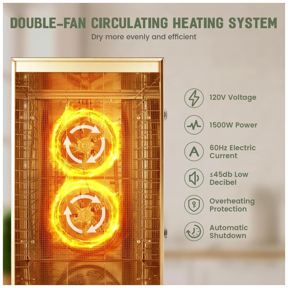 O Desidratador de Alimentos Comercial de 1500W é equipado com ventilador de secagem de fileira dupla e tecnologia de circulação de ar com velocidade de 2m/s e 1600rpm. Essas tecnologias garantem um processo eficiente de secagem dos alimentos e evitam o superaquecimento do aparelho.