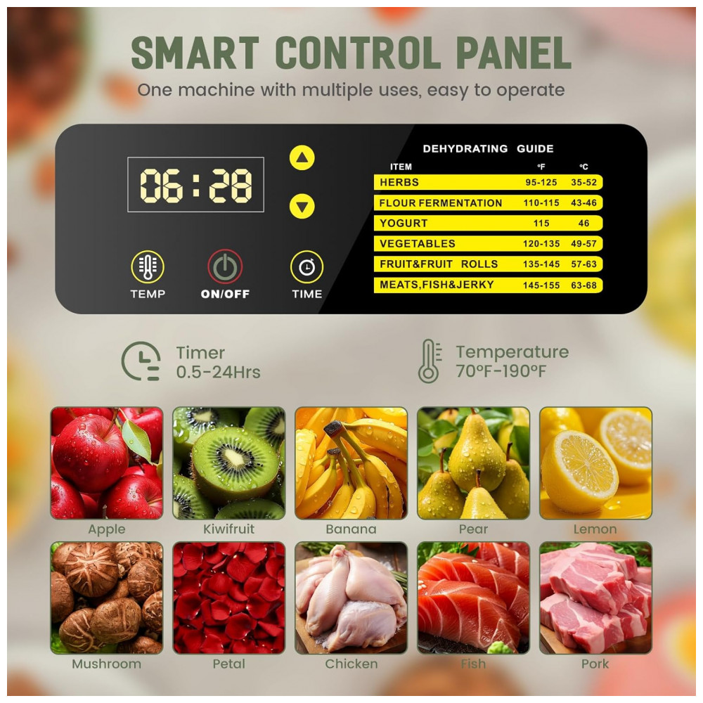 Design inovador e dividido facilita a limpeza. Configurações digitais de temperatura variam de 40ºC a 90ºC com um temporizador integrado de 0,5 a 15 horas, proporcionando tempo e temperatura de secagem precisos.