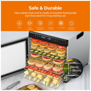 Desidrate alimentos de maneira rápida e uniforme com o Desidratador de Alimentos em Aço Inoxidável de 10 Bandejas da YASHE. Com um potente motor de 1100W e ventiladores traseiros duplos, este desidratador oferece uma secagem eficiente com circulação de ar de 360 graus, garantindo distribuição de calor uniforme e resultados consistentes – sem necessidade de girar as bandejas. Controle preciso de tempo e temperatura, ajustável de 35°C a 75°C, permite personalizar o processo de desidratação. Com capacidade para 10 bandejas em aço inoxidável, telas de malha e folhas para rolinhos de frutas, este desidratador oferece amplo espaço para secar jerky, frutas, legumes, ervas e petiscos para cães. Seguro, durável e fácil de limpar, feito com aço inoxidável premium e bandejas livres de BPA, possui desligamento automático e proteção contra superaquecimento. As bandejas podem ir à lava-louças para uma limpeza sem complicações. Desfrute de uma operação silenciosa e receba um livro de receitas como bônus, inspirando a criação de snacks caseiros como frutas desidratadas e jerky.