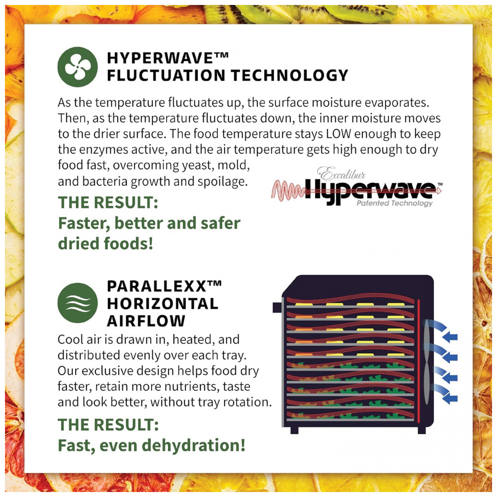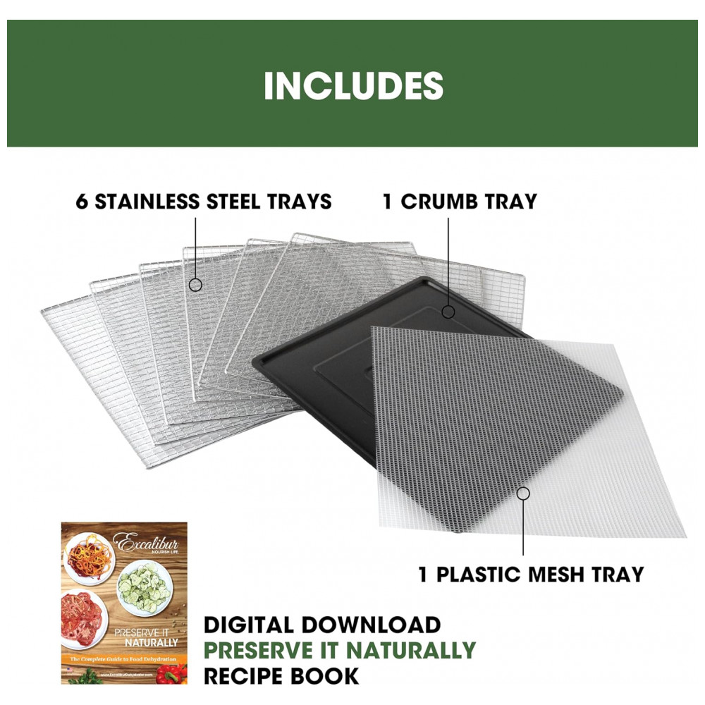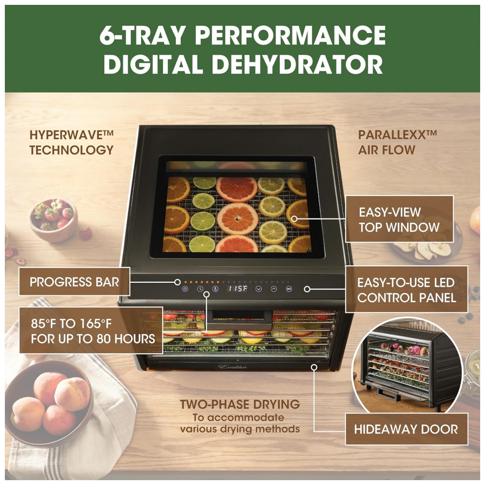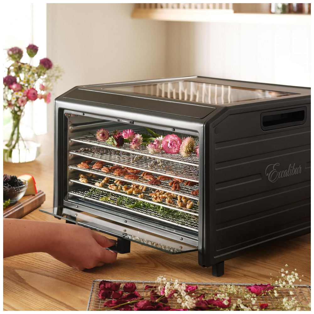 O Desidratador de Alimentos Excalibur Performance Series de 6 bandejas é o companheiro perfeito para quem deseja preservar alimentos de forma saudável e eficiente. Com uma ampla faixa de temperatura ajustável e um temporizador ajustável de até 80 horas, este desidratador oferece controle preciso sobre o processo de secagem. As 6 bandejas revestidas em aço inoxidável fornecem 890cm2 de espaço de secagem, permitindo desidratar grandes quantidades de alimentos simultaneamente, economizando tempo e esforço. Equipado com tecnologias avançadas como Hyperwave e Paralexx, este desidratador garante circulação constante de ar e distribuição uniforme de calor em todas as bandejas, resultando em desidratação eficiente e consistente para produtos finais excepcionais. Com a porta de vidro levadiça e a janela de visualização superior, é possível observar o processo de secagem sem abrir a unidade, mantendo um ambiente de secagem estável e garantindo que você obtenha resultados perfeitos sempre. Além disso, o painel frontal com tela sensível ao toque LED facilita a operação, proporcionando fácil acesso a controles intuitivos de temperatura, tempo e outras configurações. Limpar depois de suas aventuras de desidratação é muito fácil. Basta lavar à mão as bandejas e a tela de poliéster com água morna e sabão, enxaguar e secar ao ar. Este desidratador vem com várias bandejas inclusas e um livro Preserve It Naturally, um guia completo que irá inspirar sua criatividade e ajudá lo a explorar diversas receitas e técnicas de preservação. Eleve seus esforços culinários e embarque em uma jornada de preservação de sabores naturais e criação de lanches nutritivos com o Desidratador de Alimentos Excalibur Performance Series de 6 bandejas.