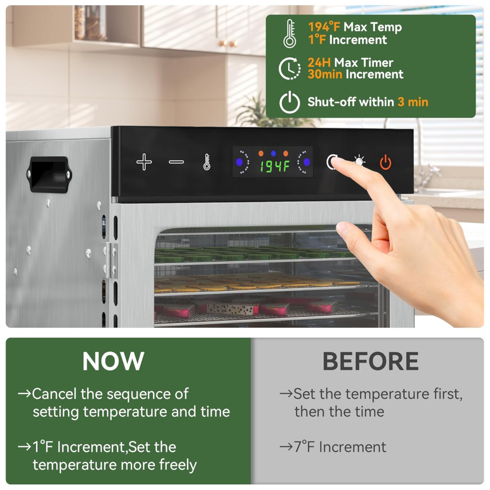 A bandeja de aço inoxidável é removível e pode ser lavada na máquina de lavar louça para facilitar a limpeza. O desidratador é silencioso durante o processo de secagem, permitindo seu uso durante a noite sem perturbações.