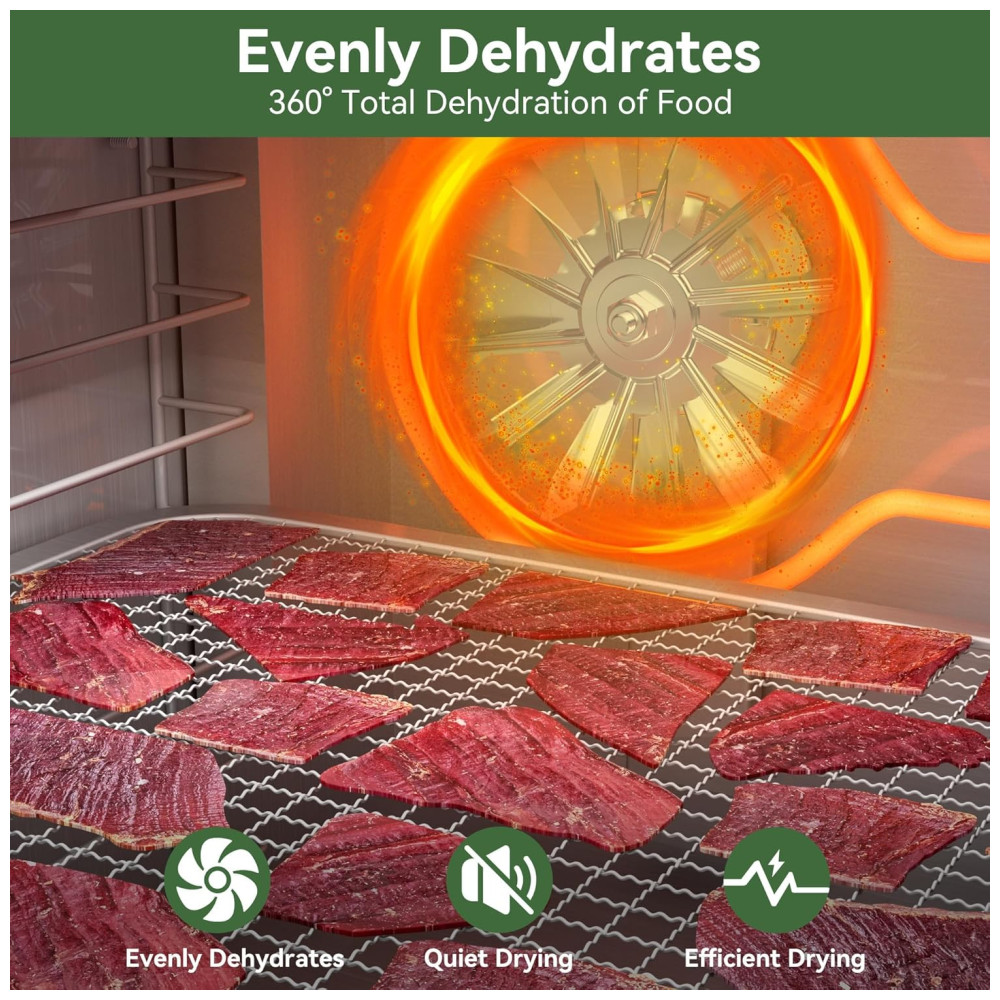 O desidratador desliga automaticamente em 5 minutos quando o cronômetro termina ou é desligado manualmente. O ventilador traseiro e o elemento de aquecimento garantem uma secagem uniforme enquanto preservam nutrientes e sabores.