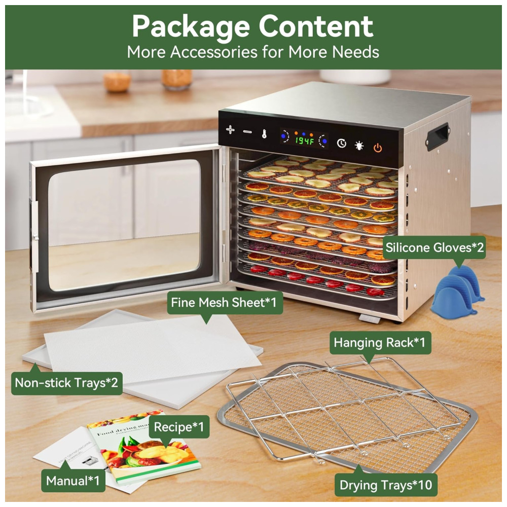 Desidratador de alimentos em aço inoxidável VALONDINO com 10 bandejas de 27 x 20 cm, 2 bandejas antiaderentes, 2 luvas de silicone, 1 folha de malha fina, 1 suporte suspenso, 1 manual e um livro de receitas com 67 opções saudáveis e saborosas.