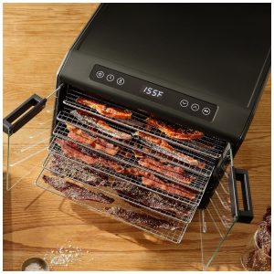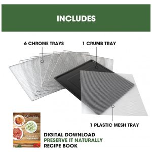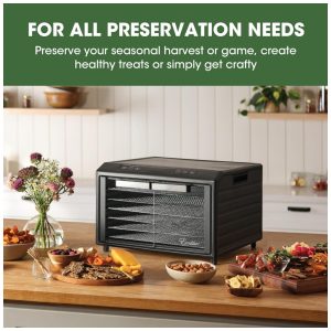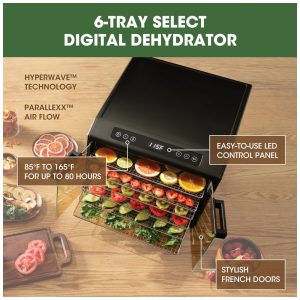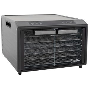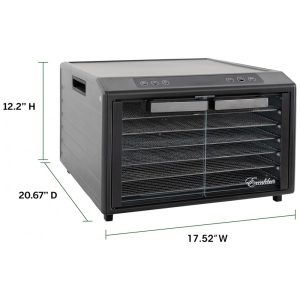 Desidratador de Alimentos em Aço Inoxidável com Controle de Temperatura Ajustável 6 Bandejas Cromadas e Portas Francesas de Vidro 700W Excalibur Preto