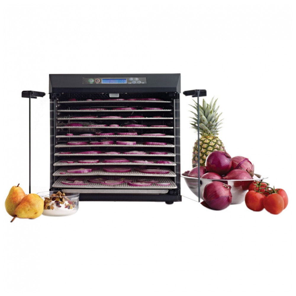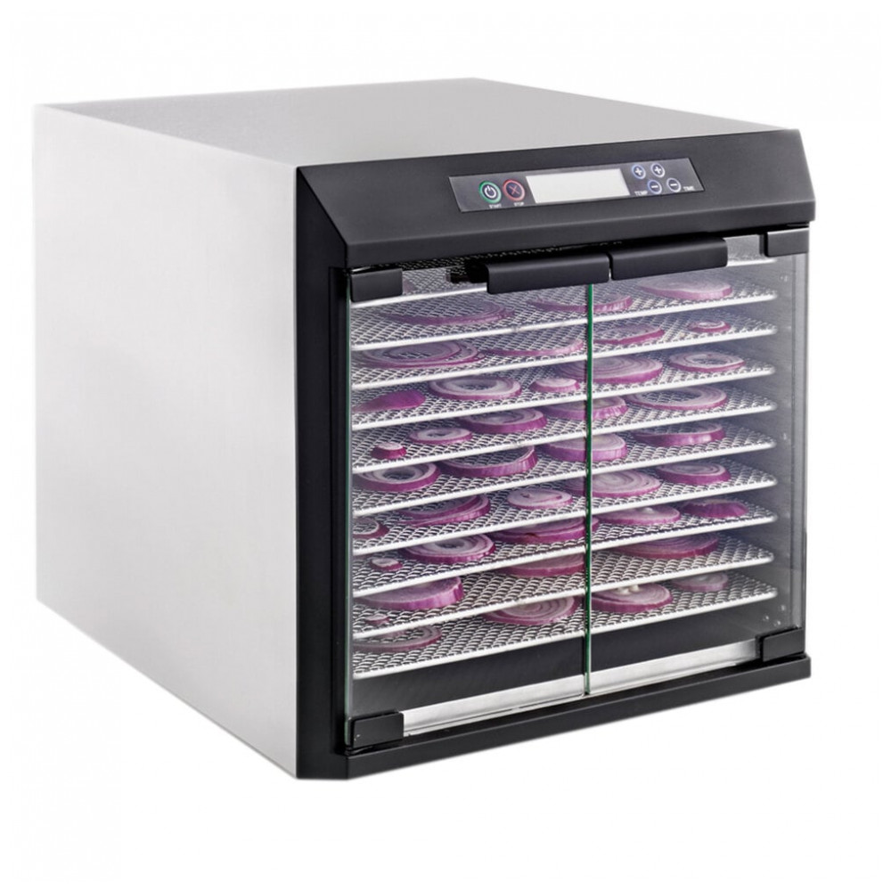 O desidratador de alimentos Excalibur EXC10EL em aço inoxidável oferece 10 bandejas removíveis de 38,1 cm x 38,1 cm para secagem de frutas, vegetais, carnes, granola e purês em processos com duas temperaturas e tempos programáveis. Com fluxo de ar horizontal via ventilador de 16,5 cm, timer de 99 horas com desligamento automático e faixa de 95-165°F (35-74°C), suporta uso heavy duty em countertop para caçadores, negócios caseiros e crafting. Portas de vidro blindado permitem monitoramento sem perda de retenção térmica; painel frontal facilita instalação sob armários.