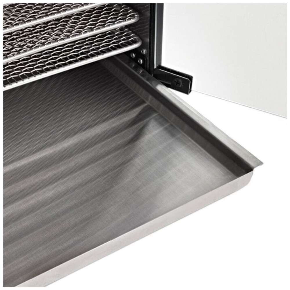 Corpo em aço inoxidável durável. Bandejas em aço inoxidável removíveis; bandeja de gotejamento extraível.