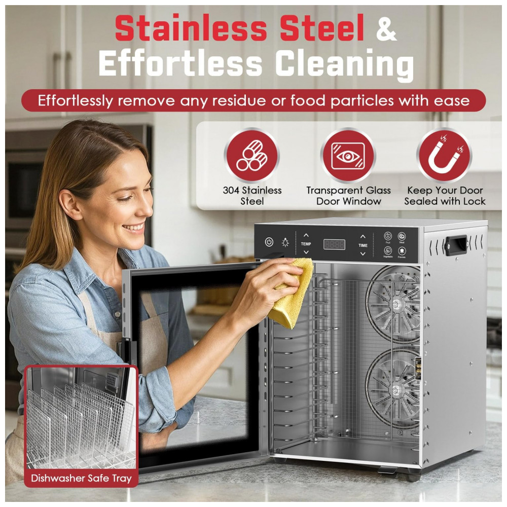 O Desidratador Profissional de Aço Inoxidável com 12 bandejas grandes de 27,94 cm x 20,32 cm oferece capacidade de secagem em grande escala. Sua estrutura elegante com porta de vidro permite fácil monitoramento, enquanto as bandejas seguras para lava-louças facilitam a limpeza. Ideal para preparar carne-seca, chips de frutas e preservação de ervas. Controle Digital Preciso com 4 Configurações que permitem personalizar o tempo de secagem de 124 horas e 30 minutos, e ajustar a temperatura de 29°C a 90°C. Aproveite as 4 configurações pré-definidas para carne-seca, frutas, vegetais, flores e adapte-as conforme sua preferência. O desligamento automático garante segurança e resultados perfeitos. Potência de 800W com Duplo Ventilador para Fluxo de Ar de 360°. Equipado com dois ventiladores traseiros de 800W, este desidratador garante secagem 30% mais rápida e uniforme que os modelos tradicionais. O sistema de fluxo de ar horizontal 360° remove eficientemente a umidade, mantendo o controle de temperatura constante. Funcionamento Silencioso e Recursos Amigáveis ao Usuário. Projetado para uso doméstico, opera com baixo ruído de 45dB, mais silencioso que a maioria dos concorrentes. A luz interior permite monitoramento noturno, e as luvas de silicone inclusas garantem manuseio seguro das bandejas quentes. Kit Completo para Lanches Saudáveis, incluindo 12 bandejas em aço inoxidável, 2 telas de malha, 1 folha para rolo de frutas, 1 bandeja de gotejamento e livro de receitas. Ideal para famílias, entusiastas da saúde e donos de animais de estimação criarem lanches ricos em nutrientes sem esforço.